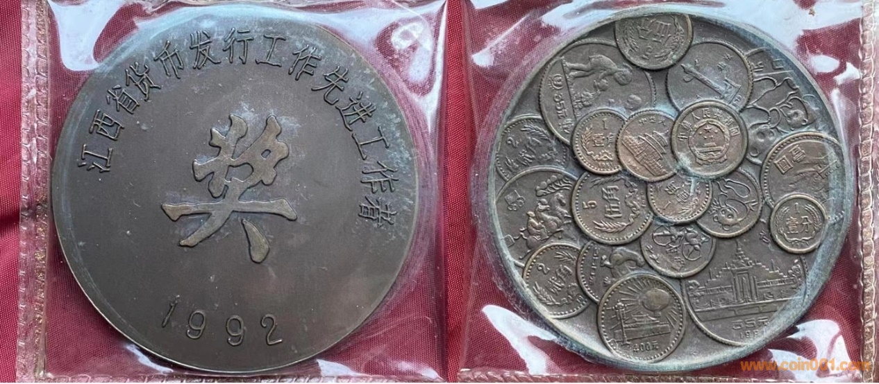 18. 全國(guó)貨幣發(fā)行出納人員榮譽(yù)獎(jiǎng)?wù)拢ā铮?br />90年代制造,60mm紫銅普制,上幣發(fā)行。正面為長(zhǎng)城幣1元,長(zhǎng)城幣2角、長(zhǎng)城幣5角及分幣等疊幣圖,反面為主題文字。