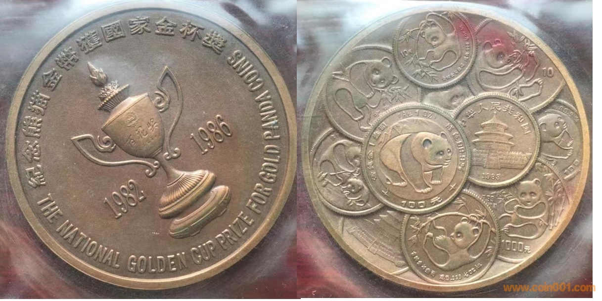 1986年制造,紫銅上色50mm,上幣發(fā)行。正面為獎(jiǎng)杯,反面為熊貓疊幣。此章疑似有仿品。