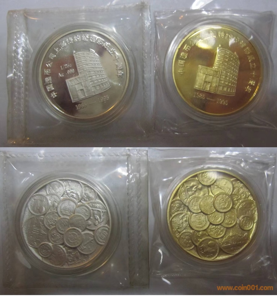 1984年制造,60mm,上幣發(fā)行。正面為上幣大樓,反面為熊貓疊幣、金銀幣疊幣、建三五疊幣以及長(zhǎng)城幣疊幣圖。