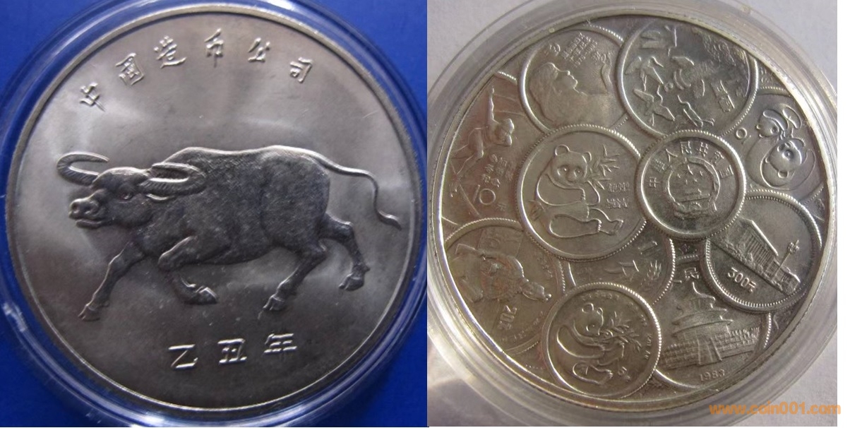 1985年制造,白銅普制,30mm。上幣發(fā)行。正面為牛,反面為熊貓、金銀幣及分幣疊幣圖。