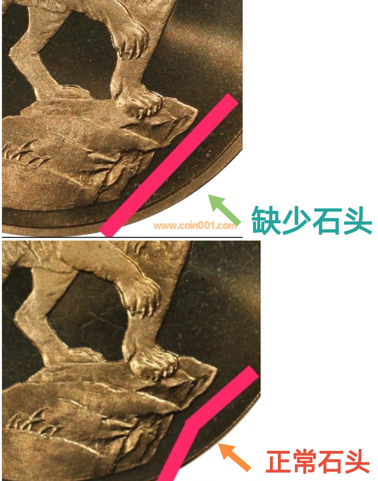 我們知道,在珍稀動物紀念幣里有名譽品“缺石虎版”,因其與普通的華南虎紀念幣相比,明顯少了一部分石頭(見附圖)。