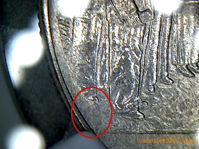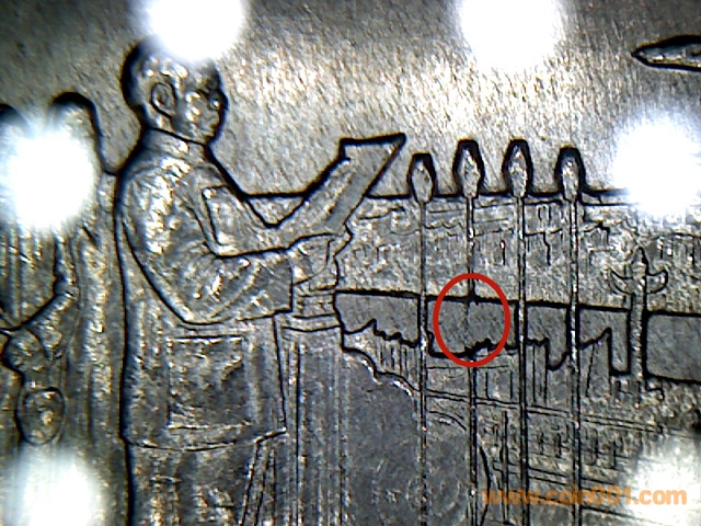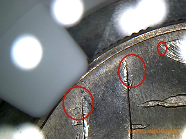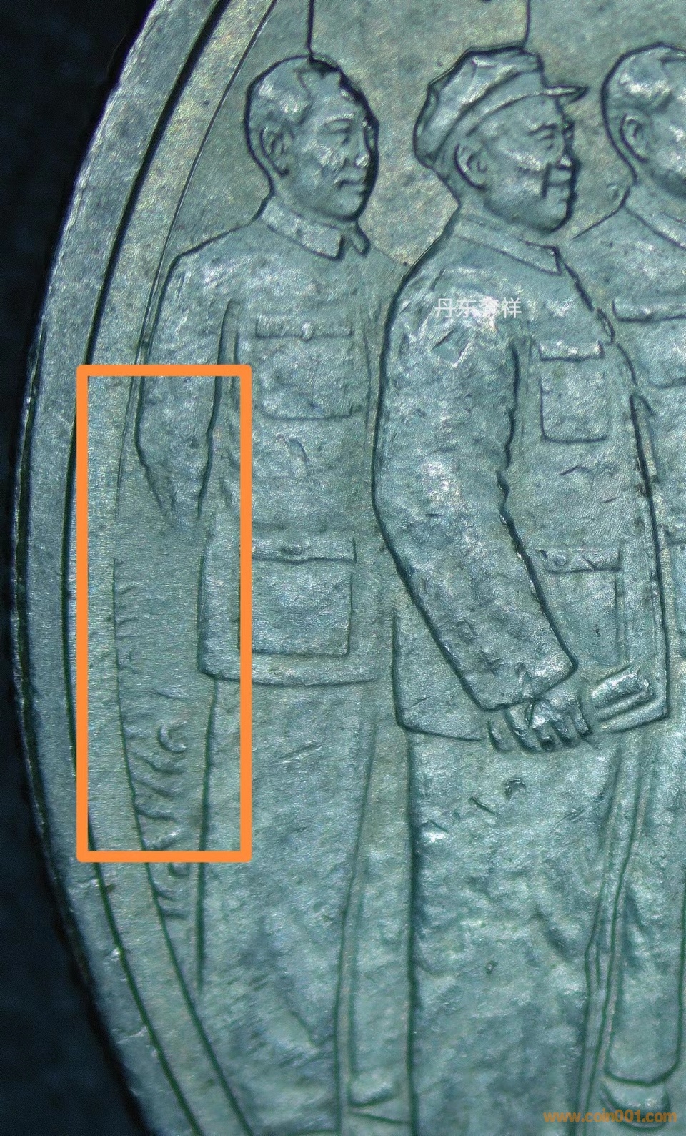 經(jīng)觀察,缺失地毯的地方,有密集的鑄造紋,這些鑄造紋為左右方向,與錢幣正、反面的鑄造紋相同。那么,說明造幣廠技師在工作中觀察不細,此模具應當作報廢處理的。