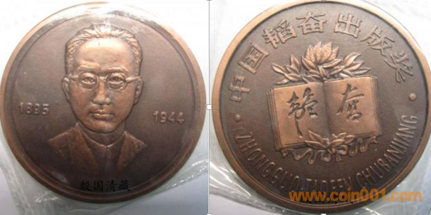6. 韜奮獎(jiǎng)?wù)?br />1985年制造,紫銅上色60mm上幣發(fā)行。正面為韜奮,反面為主題文字。