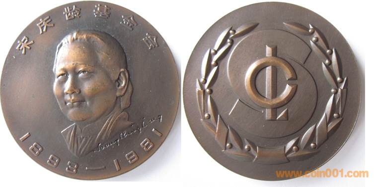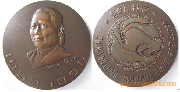 1984年制造,紫銅上色60mm上幣發(fā)行。正面為宋慶齡,反面為徽標(biāo)。
