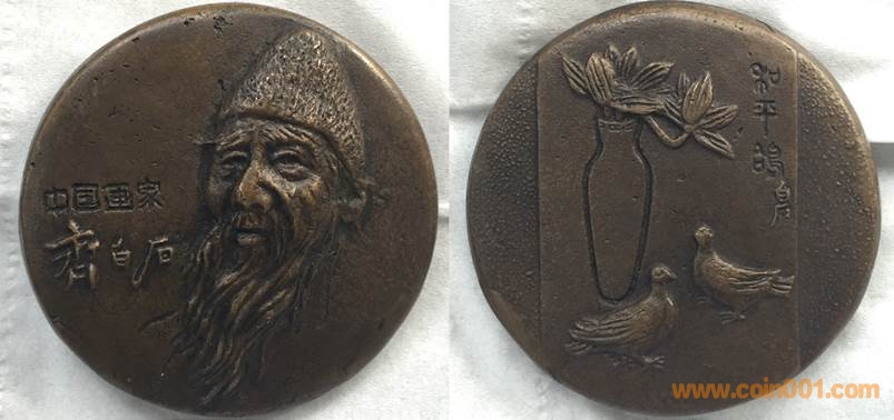 1981年制造,黃銅澆筑58mm上幣發(fā)行,發(fā)行量10枚內(nèi)。正面為齊白石,反面為和平鴿。此枚為上幣第一枚且唯一一枚澆筑章。參考價(jià):20000-30000