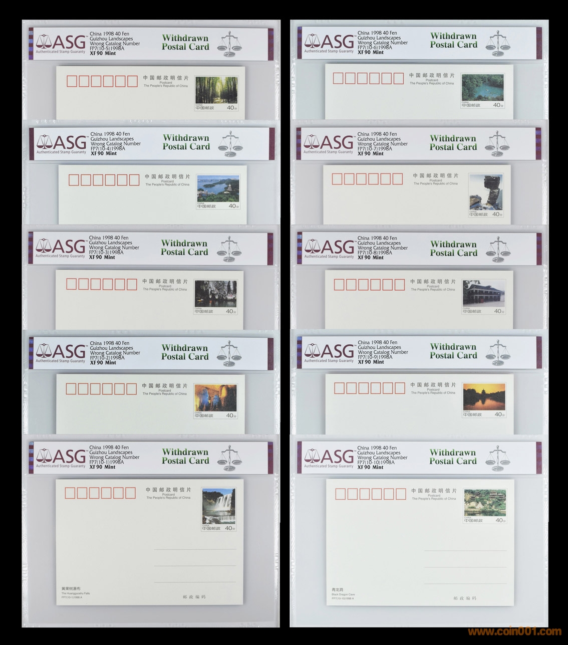 原定1998年11月25日發(fā)行的“貴州風光”郵資片,由于重慶市和陜西省的部分郵局未遵守國家郵政局的有關規(guī)定,提前20多天就對外銷售。這套明信片分為A、B兩組,A組為國內(nèi)郵資,面值40分,全套10枚,售價7元;B組為國際郵資,面值420分,全套10枚,售價45元。明信片的郵票圖案和背面圖案名稱相同,分別為:(10-1)黃果樹瀑布、(10-2)織金洞、(10-3)龍宮、(10-4)紅楓湖、(10-5)竹海公園、(10-6)小七孔、(10-7)梵凈山、(10-8)遵義會議會址、(10-9)甲秀樓、(10-10)青龍洞。公開銷售數(shù)日后,有集郵者發(fā)現(xiàn)“貴州風光”郵資片的志號FP7與7月30日發(fā)行的“武陵源風光”郵資片志號相同,便打電話向國家郵政局反映。國家郵政局接到電話后高度重視,因為把兩套風光片志號印重,就猶如把兩個人的身份證號碼弄重,以后會帶來許多問題。如果將錯就錯發(fā)行,事必會給國家郵政局帶來負面影響。在11月6日接到電話的當天下午,國家郵政局電傳全國各省、市區(qū)郵政局,通知停止銷售FP7“貴州風光”郵資片,并命令必須于11月18日前全部上交總局銷毀。隨后,重新印制了正確志號的FP8“貴州風光”郵資片,并在當年11月25日發(fā)行。