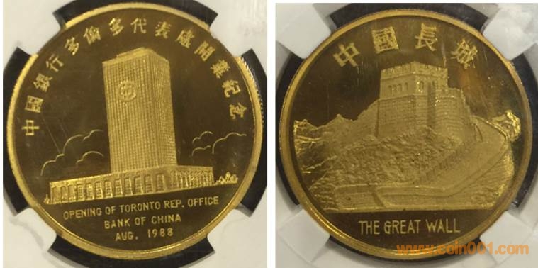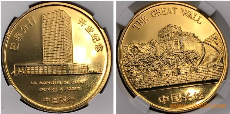 1985年制造,36mm,上幣發(fā)行。正面為銀行大樓,反面為長城。