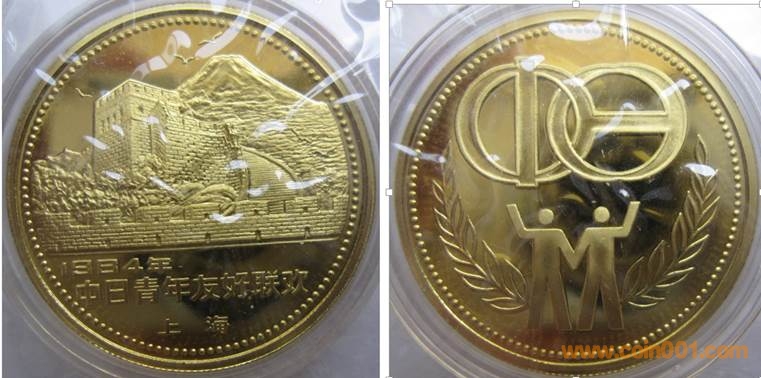 1985年制造,33mm,上幣發(fā)行。正面為長城及富士山,反面為中日貨幣圖案。