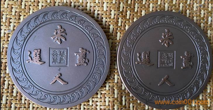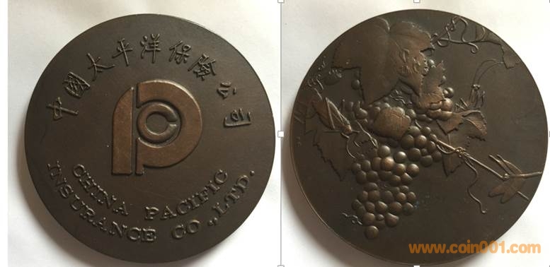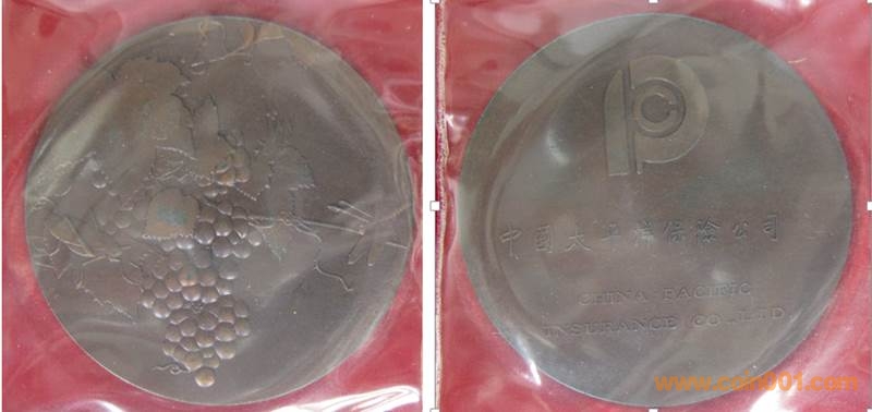 1990年制造,紫銅上色60mm上幣發(fā)行。正面為太平洋保險(xiǎn)公司徽標(biāo),反面為葡萄蟲草。參考價(jià):500-1000.