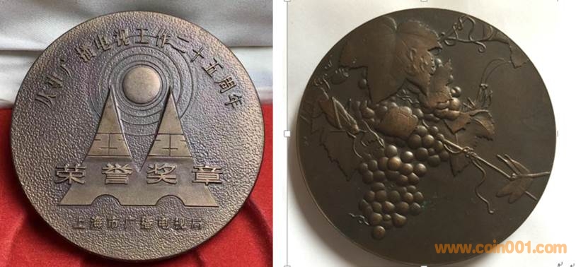 6.    從事電子廣播電視工作二十五周年榮譽(yù)獎(jiǎng)?wù)?br />1991年制造,紫銅上色60mm上幣發(fā)行。正面為主題文章,反面為葡萄蟲草。此章后期有仿品。參考價(jià):300-600