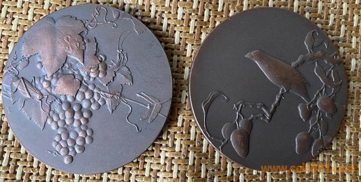 1983年制造,紫銅上色60mm上幣發(fā)行,發(fā)行量26000套(一套兩枚)。正面為葡萄蟲草及小鳥,反面為宋人畫選字樣。