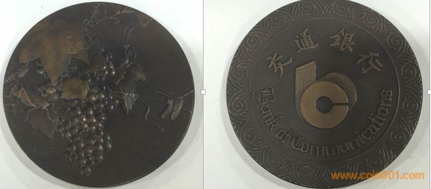 1986年制造。紫銅上色60mm上幣發(fā)行。正面為交通銀行行徽,反面為葡萄蟲草。