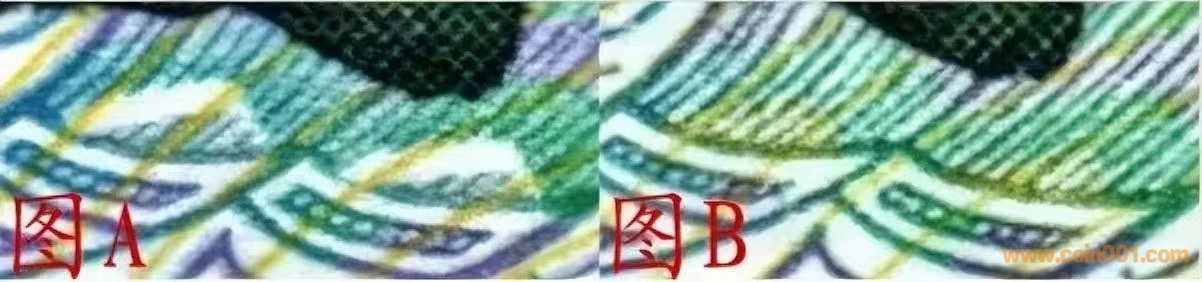 對(duì)比底紋發(fā)現(xiàn),兩種底紋系制版不同所致,并非印制過(guò)程錯(cuò)位、漏印所致,主要區(qū)別在于圖A底紋中大鳳凰尾部較圖B底紋中大鳳凰尾部多出2條規(guī)則的空白線條,具體見下圖:除了以上明顯的區(qū)別,兩種底紋還有很多不同之處,這里就不一一用表述了。