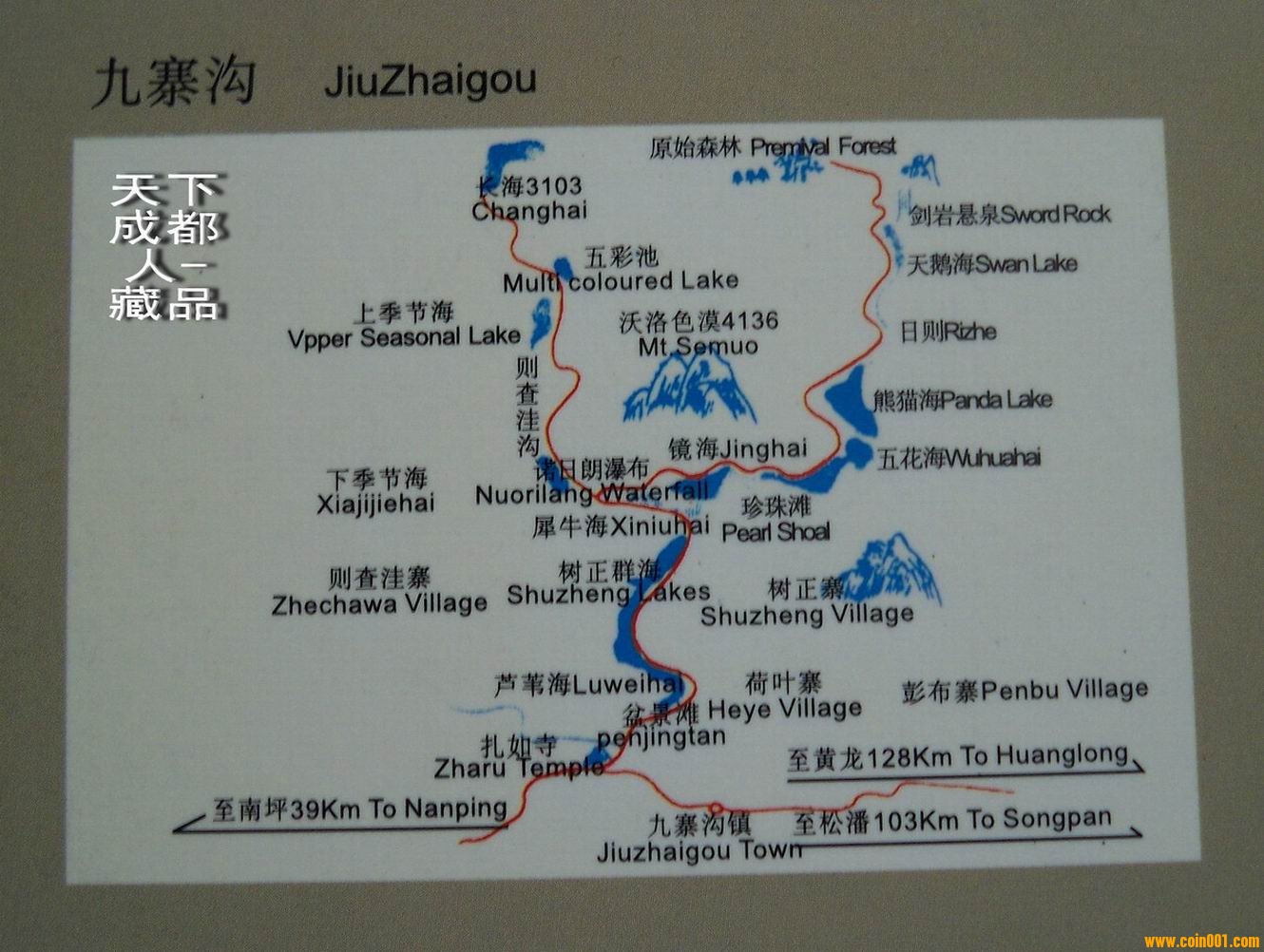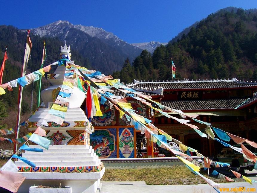 松潘,沿途有都江堰,青城前、后山、疊溪海子等名勝??刹少徝h蘋果。至黃龍寺約393公里,九寨溝440公里。此路修繕較好,基本都走這條路。