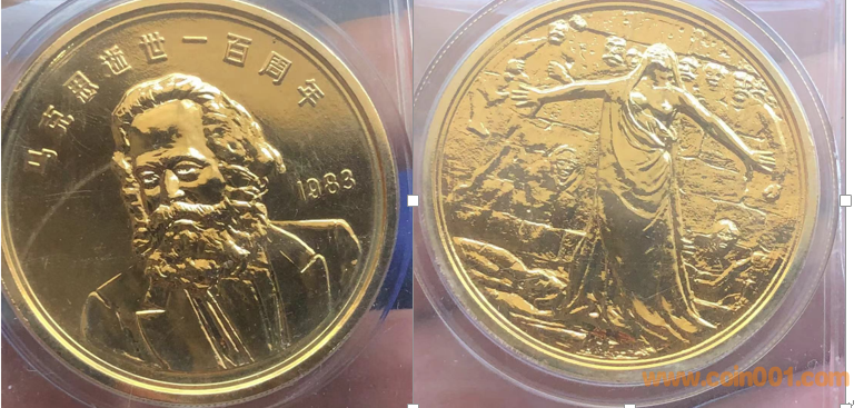 1983年制造,黃銅普制鍍金40mm沈幣發(fā)行。正面為馬克思頭像,反面為巴黎公社墻。