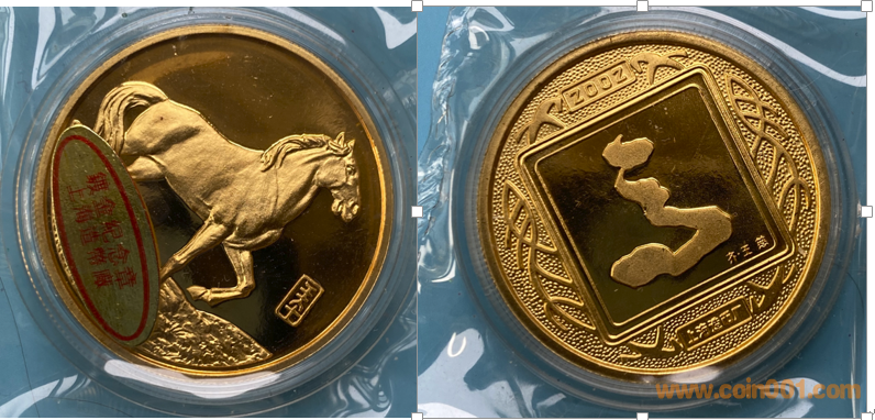 1985年制造,黃銅普制鍍金33mm上幣發(fā)行。正面為奶牛,反面為黃金萬兩。