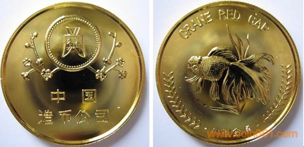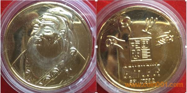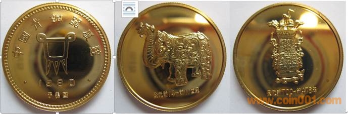 1980年制造,黃銅普制鍍金27mm上幣發(fā)行。正面為主題文字,反面為象尊于蓮鶴方壺。參考價:2000-4000