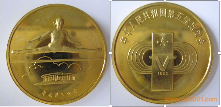 1983年制造,黃銅普制鍍金33mm上幣發(fā)行。正面為五運會會徽,反面為佳妮騰躍。
