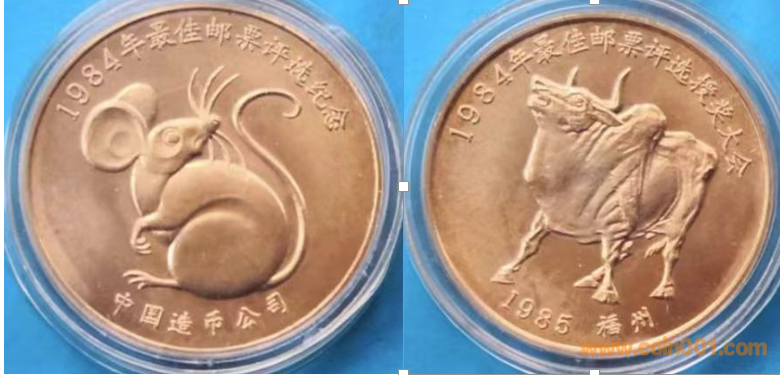 1984年制造,黃銅普制鍍金33mm上幣發(fā)行。正面為鼠,反面為牛。參考價:100-200