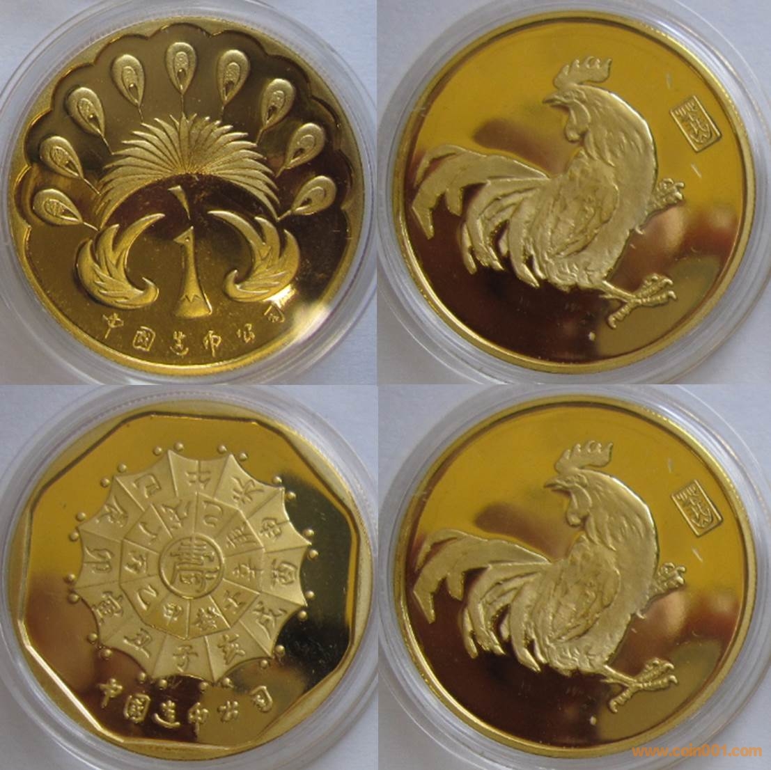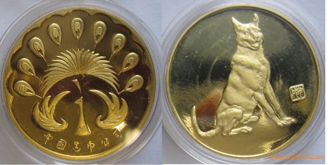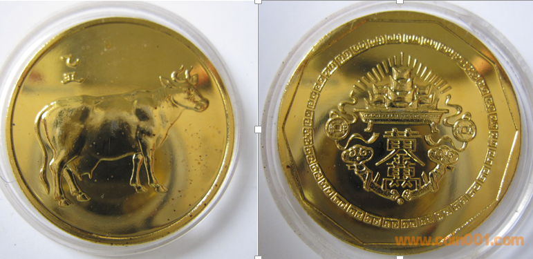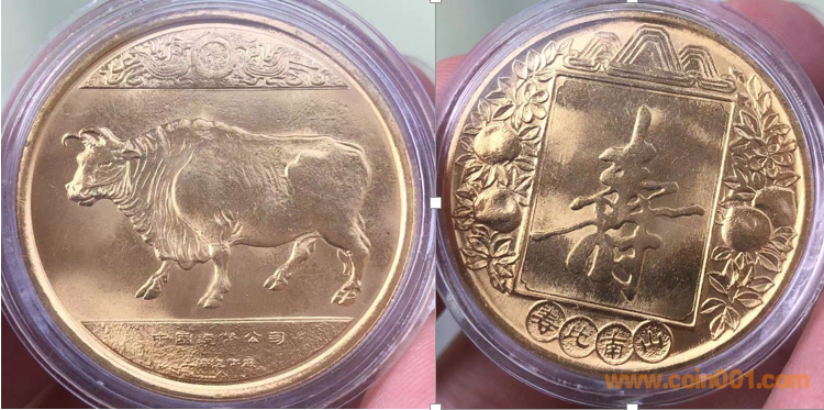 1985年制造,白銅普制鍍金30mm上幣制造。正面為牛,反面為壽字、疊幣。