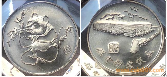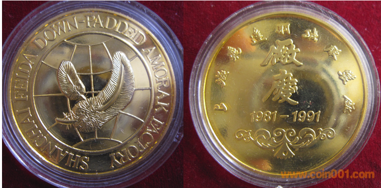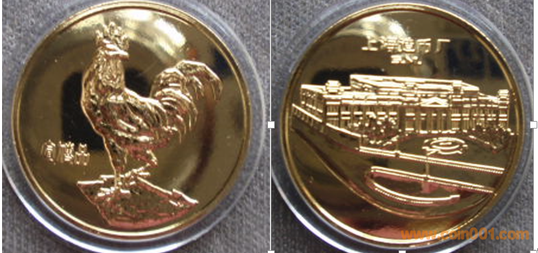 1981年制造,黃銅普制鍍金27mm上幣發(fā)行。正面為宣傳品雞,反面為上幣辦公大樓。