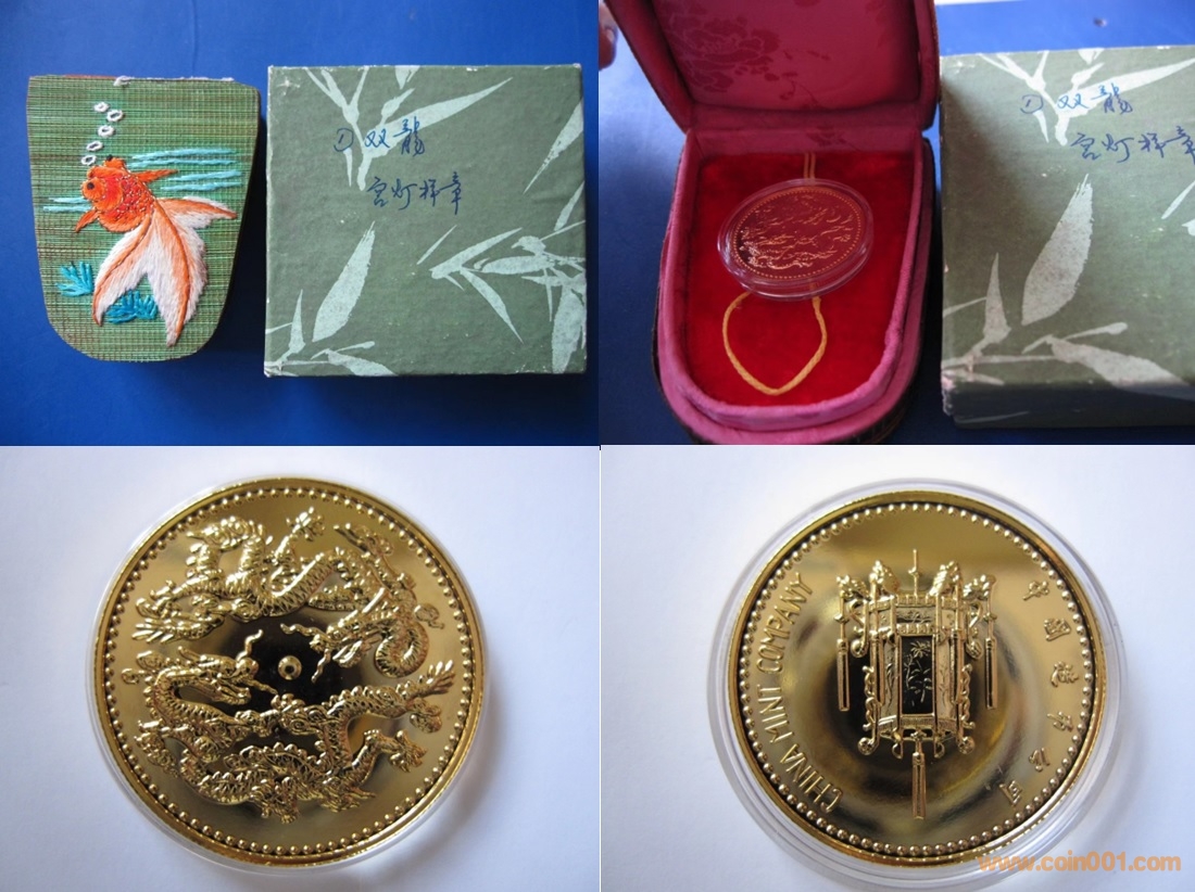 80年代制造,黃銅普制鍍金27mm上幣發(fā)行。正面為雙龍,反面為有款無年號宮燈。