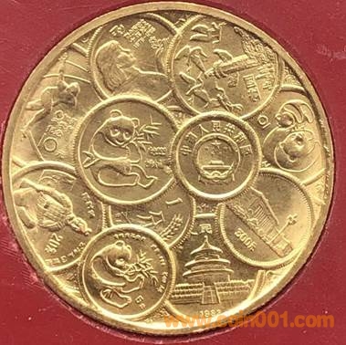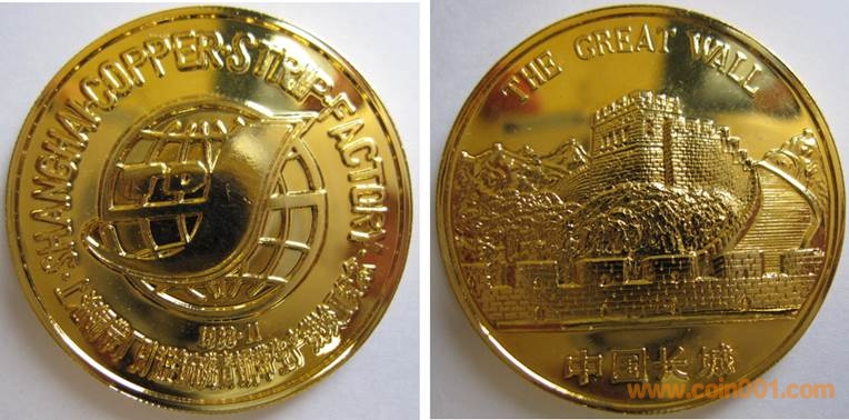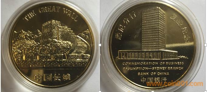 1985年制造,黃銅普制鍍金36mm上幣發(fā)行。正面為中國長城,反面為中國銀行大樓。