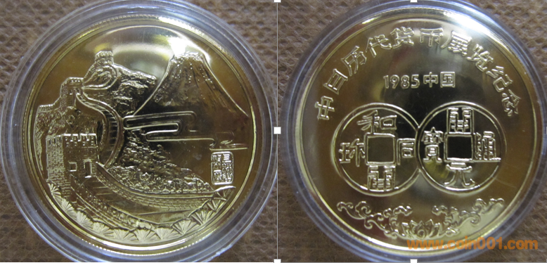 1985年制造,黃銅普制鍍金33mm上幣發(fā)行。正面為長城、富士山。反面為開元通寶。
