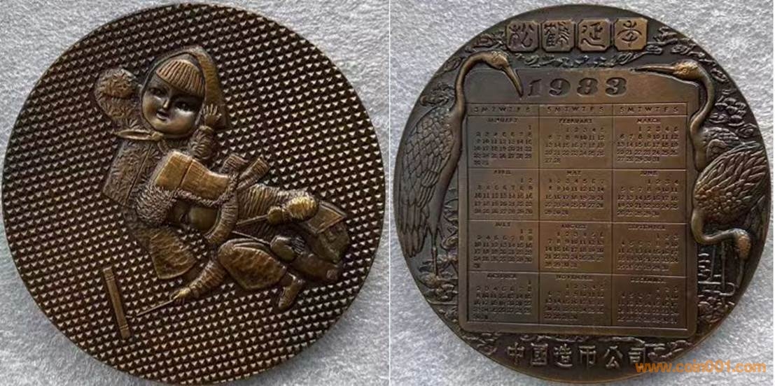 3.放爆竹(白文均)1983年制作,紫銅上色60mm,正面為小女孩及小男孩放爆竹,反面為83年松鶴延年日歷牌。