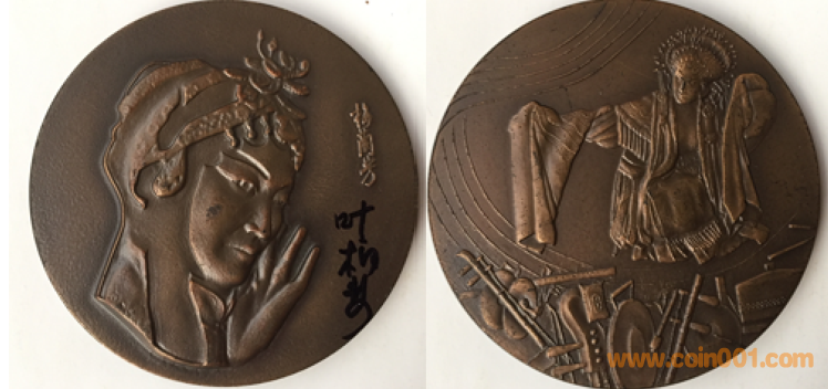 4.梅蘭芳(葉柏林)1986年設(shè)計(jì)雕刻師練手作品,制造量10枚內(nèi),紫銅鍍金鍍彩及紫銅上色60mm。正面為梅蘭芳形象,反面為《貴妃醉酒》藝術(shù)造型飾以眾多京劇伴奏樂器、如二胡、月琴、竹笛、單皮鼓、大鑼、小鑼等。