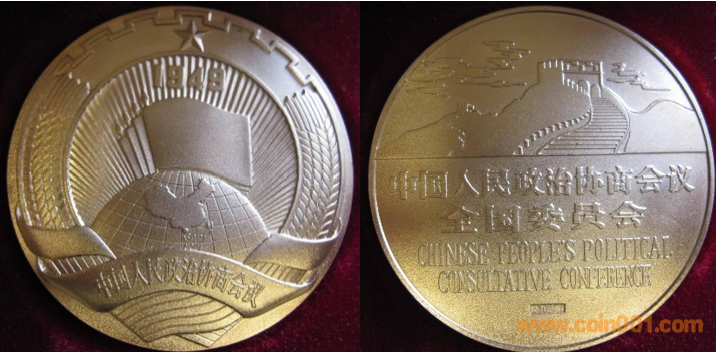 2.中國人民政治協(xié)商會(huì)議(裔式忠)1982年內(nèi)部發(fā)行,紫銅(待考)鍍金60mm。正面為政協(xié)會(huì)徽,反面(機(jī)雕)為長城及中英文字及上海造幣廠廠銘。