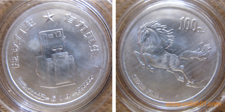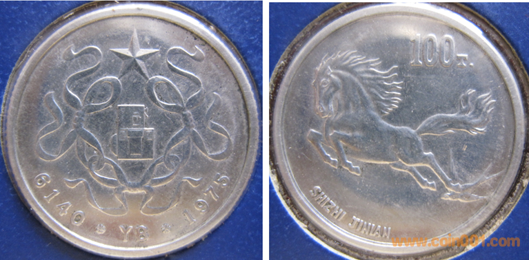 1978年上幣制造,鋁普制23mm。正面為YB75沖壓機,反面為馬踏飛燕。市面上常見后鑄版,筆者認為疑似仿品。