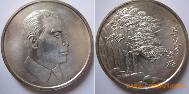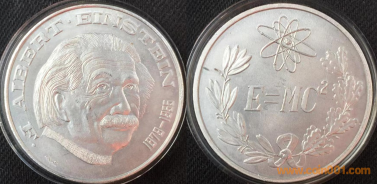 愛因斯坦:1982上幣制造,鋁普制38.6mm。制造量:10枚內(nèi)。設(shè)計雕刻:方茂森(手雕)。正面為愛因斯坦頭像,反面為愛因斯坦著名能量公式。