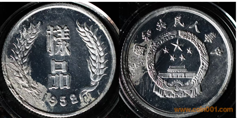 1952年上幣制造,鋁普制24mm。正面為“樣品”字樣,反面為國徽。