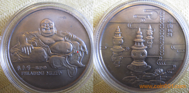 80年代上幣制造,白銅普制27mm。正面為飛來峰彌勒佛,反面為三潭印月(豎排)。