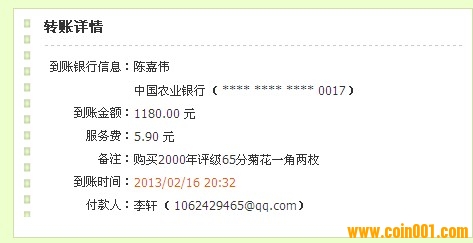 引用 引用第6樓徐州李軒于2013-02-16 11:36發(fā)表的 :電聯(lián)確認(rèn)兩枚65分2000菊花一角,賣家包順豐,盡快打款,包盒子完好無(wú)損即可,合作愉快