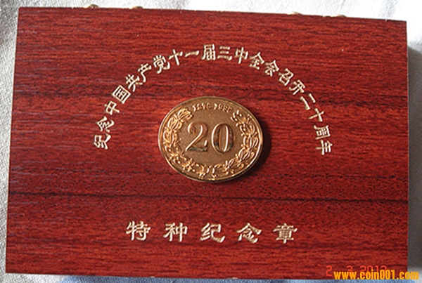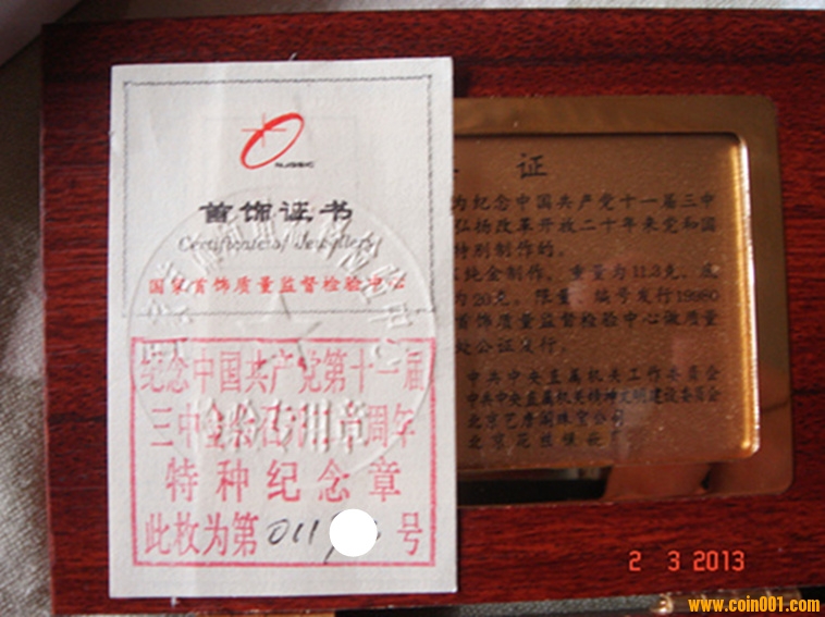 本章含純金11.3克,純銀20克,是為紀(jì)念11屆三中全會(huì)召開20周年特發(fā),限量發(fā)行19980枚,00001號(hào)由國(guó)家收藏。該章設(shè)計(jì)精美,簡(jiǎn)潔大方,正面是改革開放總設(shè)計(jì)師鄧小平肖像,背面是“黨徽”及24K純金標(biāo)志。由于發(fā)行方式特殊,該章真品市場(chǎng)極少。