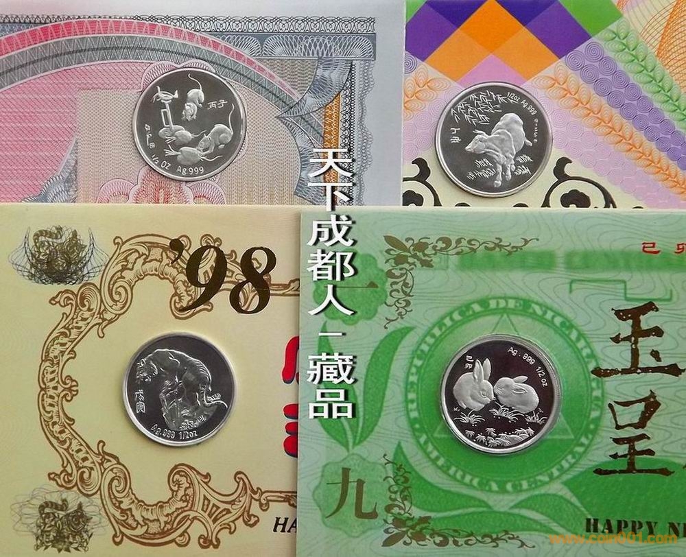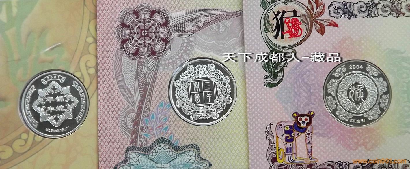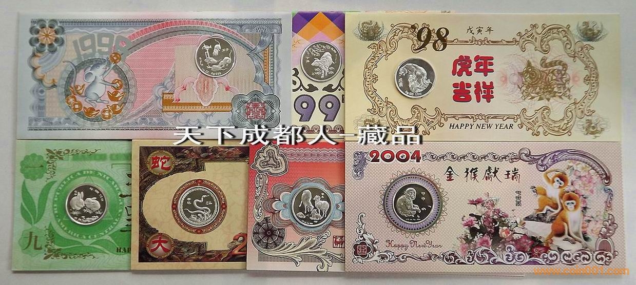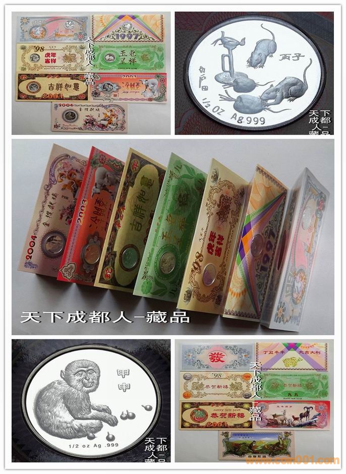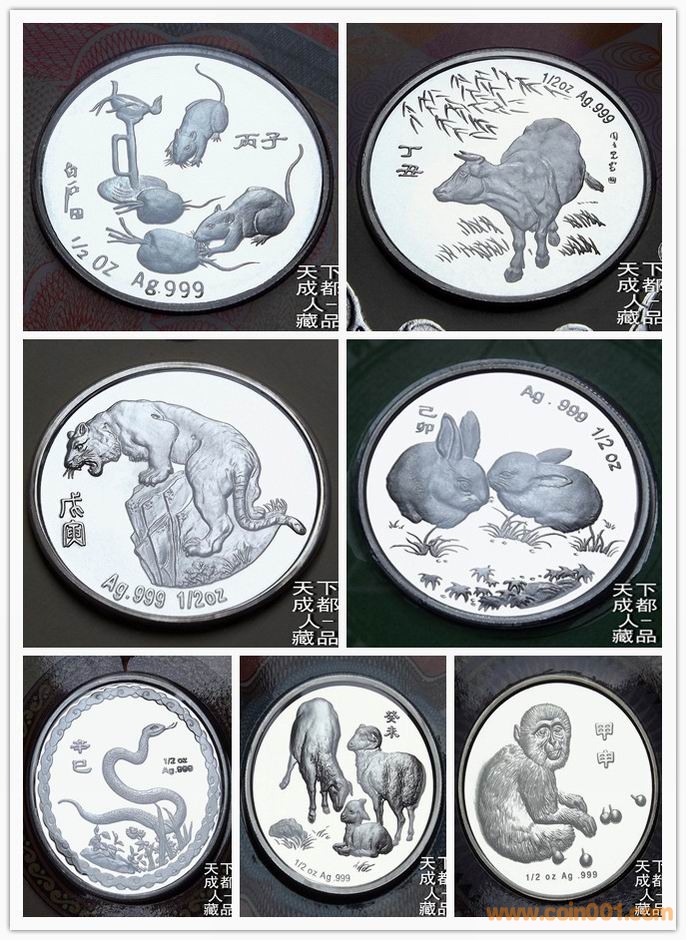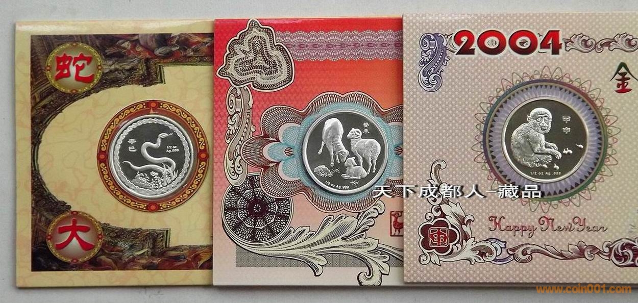 沈陽造幣廠從1996年起逐年鑄造發(fā)行《1996年生肖鼠、1997年生肖牛、1998年生肖虎、1999年生肖兔、2001年生肖蛇、2003年生肖羊、2004年生肖猴(精制)純銀紀念章賀歲卡》共7張賀卡7枚銀章裝(總重3.5盎司共109克)。各生肖章材質(zhì)純銀、精制帶齒邊工藝,各章重量1/2盎司、成色99.9%、直徑33毫米。 各銀章均刊有重量和成色字樣、質(zhì)量標準、重量合格。沈幣原折式鑲嵌生肖銀章賀歲卡裝幀。