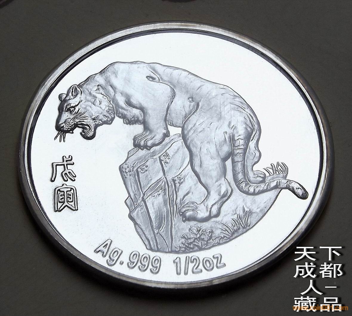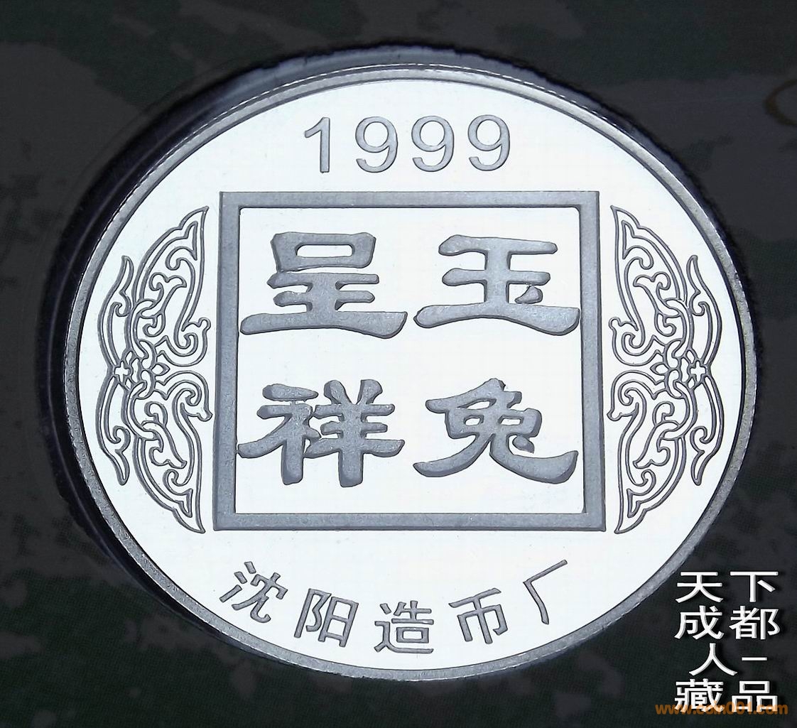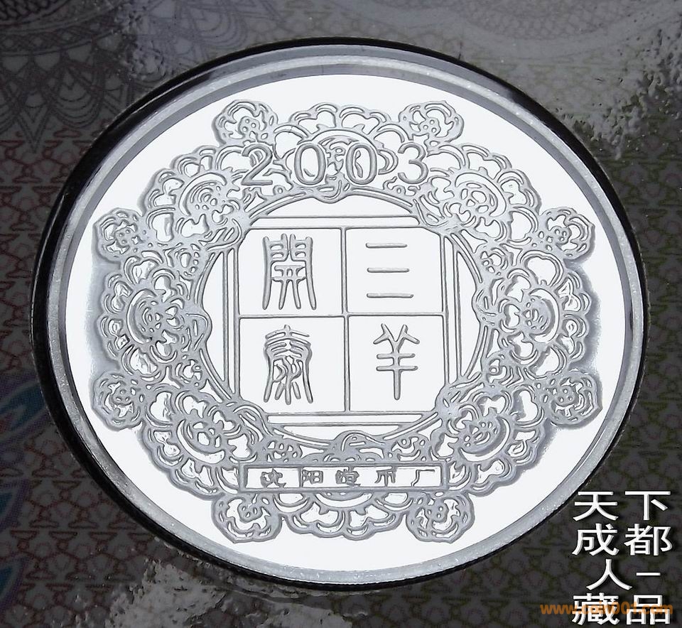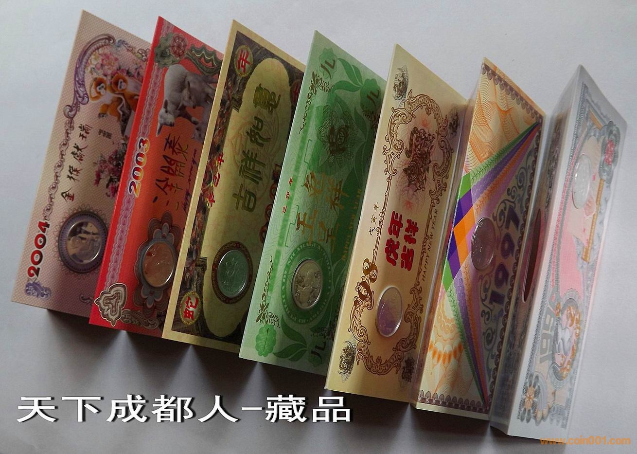 沈陽造幣廠從1996年起逐年鑄造發(fā)行《1996年生肖鼠、1997年生肖牛、1998年生肖虎、1999年生肖兔、2001年生肖蛇、2003年生肖羊、2004年生肖猴(精制)純銀紀念章賀歲卡》共7張賀卡7枚銀章裝(總重3.5盎司共109克)。各生肖章材質(zhì)純銀、精制帶齒邊工藝,各章重量1/2盎司、成色99.9%、直徑33毫米。 各銀章均刊有重量和成色字樣、質(zhì)量標準、重量合格。沈幣原折式鑲嵌生肖銀章賀歲卡裝幀。
