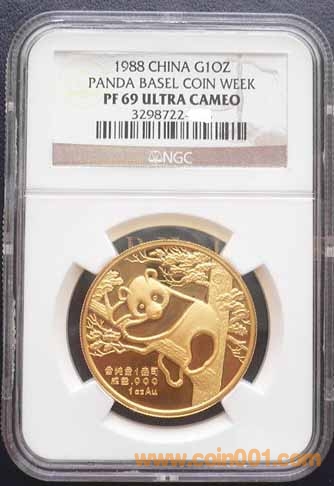 1988年瑞士巴塞爾國際硬*幣周紀念金章,黃金材質(zhì),含純金1oz,成色.999,直徑32mm,有齒邊,發(fā)行量1000枚,(其中包括一半錯刻成Pt的)。由工藝美術(shù)大師曾成滬,余敏設(shè)計雕刻,上海造幣廠制造。 此枚紀念金章正面圖案:中國長城及瑞士巴塞爾著名建筑“Spalentor”,背面圖案為大熊貓攀樹圖。