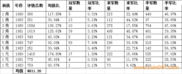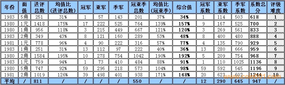 普制長(zhǎng)城幣評(píng)級(jí)難度排序2014-1 普制長(zhǎng)城幣評(píng)級(jí)難度排序與早期分幣難度排序有明顯的區(qū)別,為了能體現(xiàn)難度系數(shù)的準(zhǔn)確性和科學(xué)性在計(jì)算時(shí)考慮的因素相對(duì)要復(fù)雜一些,主要參考了評(píng)級(jí)的總數(shù),均值比(送評(píng)總數(shù)),冠亞季軍總數(shù),均值比(冠亞季總數(shù))等數(shù)據(jù)作為計(jì)算的主要依據(jù),同時(shí)各個(gè)均值段的補(bǔ)償方法也比較復(fù)雜 首先我們需要討論評(píng)級(jí)幣的價(jià)格構(gòu)成 評(píng)級(jí)幣的價(jià)格構(gòu)成 裸幣的價(jià)格+評(píng)級(jí)溢價(jià)+評(píng)級(jí)費(fèi)用=評(píng)級(jí)幣的參考價(jià)格 主要可以參考以下2個(gè)因數(shù), 第一個(gè)因素為裸幣本生的價(jià)格(它的價(jià)格變動(dòng)主要依據(jù)裸幣成交價(jià)格的變動(dòng)而變動(dòng)與評(píng)級(jí)溢價(jià)之間的關(guān)系不大) 舉例來(lái)說(shuō): 裸幣的價(jià)格上漲1倍評(píng)級(jí)難度系數(shù)沒(méi)有變化的話,評(píng)級(jí)幣的價(jià)格應(yīng)該相應(yīng)的上漲1倍+溢價(jià)+評(píng)級(jí)費(fèi)用=評(píng)級(jí)幣的參考價(jià)格,裸幣的價(jià)格的上漲只能帶動(dòng)評(píng)級(jí)幣裸幣部分的上升,裸幣價(jià)格下跌,評(píng)級(jí)難度系數(shù)沒(méi)有變化的話,評(píng)級(jí)幣的價(jià)格為裸幣下跌的價(jià)格+溢價(jià)+評(píng)級(jí)費(fèi)用=評(píng)級(jí)幣的參考價(jià)格,裸幣的價(jià)格的下跌只能帶動(dòng)評(píng)級(jí)幣裸幣部分的下跌 第二個(gè)因素為評(píng)級(jí)難度所產(chǎn)生的一個(gè)溢價(jià) 難度系數(shù)越高它對(duì)應(yīng)的溢價(jià)就越高。溢價(jià)變化主要依據(jù)評(píng)級(jí)難度系數(shù)與系數(shù)平均值的變化和對(duì)比來(lái)決定,溢價(jià)水平的上升在一定的程度上會(huì)提升高品質(zhì)裸幣的價(jià)格(卷光卷拆的硬幣)和品相的稀缺性,裸幣價(jià)格的下跌,如果評(píng)級(jí)難度提高的話評(píng)級(jí)幣的價(jià)格反而有可能會(huì)上升,從以上的結(jié)果可以得出下列結(jié)論,溢價(jià)是評(píng)級(jí)價(jià)格體系當(dāng)中最重要的組成部分,溢價(jià)和裸幣的價(jià)格體系完全是獨(dú)立的,之間的價(jià)格沒(méi)有直接的聯(lián)系 備注:關(guān)于這個(gè)數(shù)據(jù)的準(zhǔn)確性在設(shè)計(jì)這個(gè)表的時(shí)候我已經(jīng)考慮到了一個(gè)重評(píng)的可能性所以我只取冠,亞,季軍作為一個(gè)參考并同時(shí)設(shè)計(jì)了一個(gè)補(bǔ)償方案,重評(píng)從時(shí)間和金錢(qián)的角度來(lái)衡量的話不是非常經(jīng)濟(jì)且還存在一定的風(fēng)險(xiǎn),但是從長(zhǎng)遠(yuǎn)看不能排除這個(gè)因數(shù)。雖然將來(lái)會(huì)產(chǎn)生一些誤差,但我認(rèn)為誤差不會(huì)太大尤其在高分段和稀缺性的錢(qián)幣,對(duì)于普制長(zhǎng)城幣來(lái)說(shuō)NGC已經(jīng)作為收藏的主流其數(shù)據(jù)的準(zhǔn)確性還是比較值得信賴的。 采樣的范圍 取樣范圍:1980-1985 普制長(zhǎng)城幣 難度排序的選擇標(biāo)準(zhǔn):送評(píng)總數(shù)的平均值高于100%的普制長(zhǎng)城幣,低于100%的數(shù)據(jù)將不體現(xiàn)在難度排序中 計(jì)算公式: 評(píng)級(jí)總數(shù)/均值=均值比