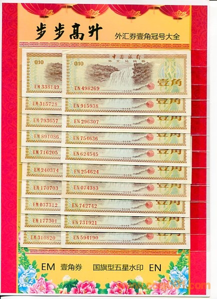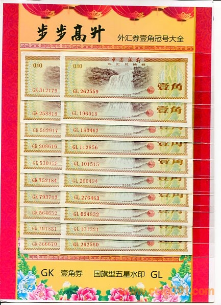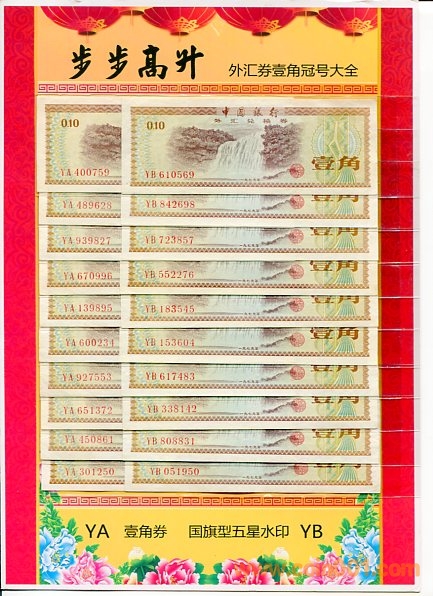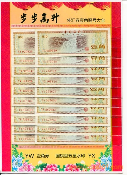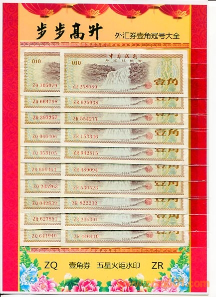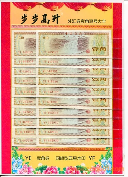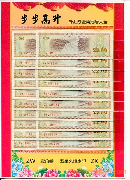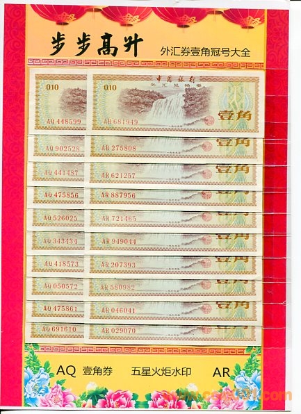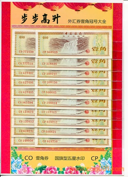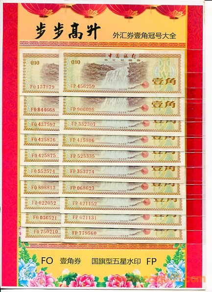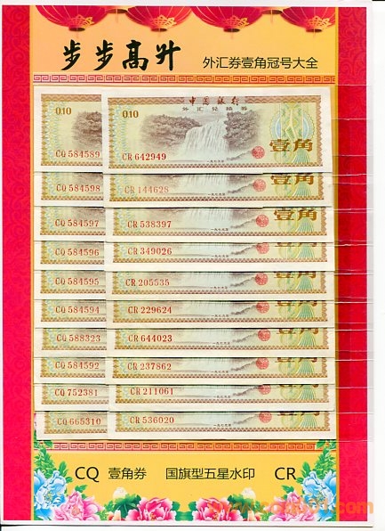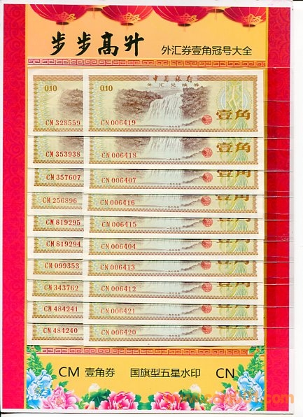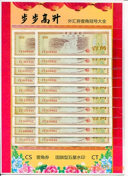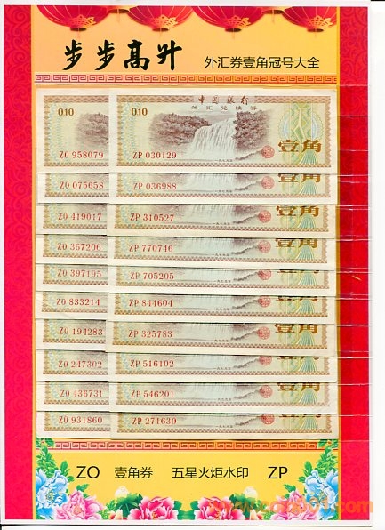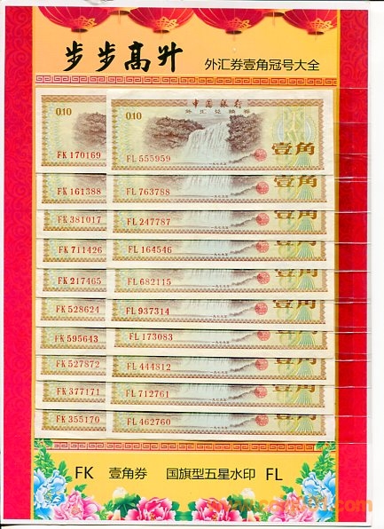 自序 1978年12月,黨的十一屆三中全會作出了實行改革開放的重大決策;中華人民共和國從此進入了具有深遠歷史意義的轉折時期,開創(chuàng)一條建設中國特色的社會主義道路。改革開放之初,由于一切都是在探索性的實踐中,致使很多措施不夠明確,執(zhí)行起來顯得混亂;尤其在金融方面,在一次次涌入大量外資后,出現(xiàn)了在國內(nèi)與人民幣變相交換和流通的現(xiàn)象,嚴重擾亂了正常的經(jīng)濟活動與金融市場,給國家經(jīng)濟造成了重大損失。為搞好金融秩序,維護人民幣的穩(wěn)定和唯一法定貨幣的地位,理順人民幣與外幣難以逾越的關系,使改革開放能順利、有序地進行,國家最高行政管理機關—國務院,授權予歷史悠久且有豐富外匯兌換經(jīng)驗的國有商業(yè)銀行—中國銀行,于1980年4月,正式發(fā)行與人民幣等值流通的有價證券:外匯兌換券(以下簡稱:外匯券)。外匯券發(fā)行的目的,是為了方便來華工作、生活的,以持外幣為主的外國人、華僑、港澳臺同胞,在中國大陸的衣食住行等消費活動。外匯券(外幣按當時的比價兌換成外匯券)可在全國指定的涉外商店(華僑商店),購買當時屬于統(tǒng)購統(tǒng)銷的緊缺商品和高檔的進口免稅商品,住上接待外賓的高級賓館,坐上有級別才能進入的軟臥火車和飛機,享受著高人一等的待遇??梢哉f,外匯券與人民幣在實際使用方面相比,其性價比還要高。為了緩和當時的政治氣氛,中國銀行秉承了以往發(fā)行紙幣的一貫風格,將國內(nèi)著名的名勝古跡、名山大川,作為紙幣的正面圖案,還有文學大家郭沫若先生的行名題詞,印在券面上。將它們美倫美奐地呈獻在世人面前,猶如一幅幅精美絕倫的名作,使人更加賞心悅目。將紙幣這種特殊的藝術品,在發(fā)揮貨幣功能的同時,讓使用者能更加多地了解中國,起到國家名片的作用,從而激發(fā)他們的旅游興趣;并讓他們在各種活動中,參與更多的消費,帶動旅游業(yè)的發(fā)展,為國家賺取更多的外匯,支持國家的經(jīng)濟建設。隨著改革開放的持續(xù)、深入的發(fā)展和全國人民的共同努力,中國已從貧窮落后且備受欺凌的弱國,躍進為世界第二大經(jīng)濟體的強國;人民的生活水平逐年提高,迎來了闊別一百多年的繁榮盛世。外匯券自問世至完成歷史使命,在短短十五年多的時間里,見證了改革開放從探索、鞏固到發(fā)展的歷史進程,在出色完成祖國賦予的重要而光榮的任務后,功成身退,進入了收藏領域。由于外匯券誕生在改革開放這一特定歷史時期,具有特別的歷史意義和文物價值,且印刷精美,猶如一幅幅優(yōu)美動人的山水藝術作品,是一個非常值得珍藏的種類。在退出流通后,初時曾一票難求。外匯券的發(fā)行,不僅穩(wěn)定了金融秩序,大大方便了來華工作、生活的外國人、華僑、港澳臺同胞在中國大陸的交流活動,并逐漸帶旺了旅游業(yè),還為國家?guī)砹舜罅康耐鈪R收入,大力支持了經(jīng)濟建設,帶動了改革開放的健康發(fā)展。外匯券由于使用的范圍不大,所以發(fā)行的總量不多。以七九年版外匯券中發(fā)行量最大的壹角券為例,壹角券總共發(fā)行了127個冠號,每個冠號的后面是六位阿拉伯數(shù)字,總發(fā)行量為一億多張,與同時期使用的第三、四版人民幣壹角券幾百億(按發(fā)行的冠號估算)的發(fā)行量相比,外匯券的發(fā)行量就顯得微不足道了。同時由于其可在特定的商店,購買緊缺商品的優(yōu)越使用條件和當時較低的生活水平,在即將停止使用和兌換時,大多數(shù)都被交換成為商品,或換成了人民幣,被銀行回籠銷毀了。因此,外匯券的總存世量相當少。本組集以陳正統(tǒng)老師的研究成果—外匯兌換券冠號大全(總共有324個冠號)為基礎,選取其中的壹角券與壹圓券冠號大全(共201個冠號)進行擴展,將201個冠號的尾數(shù)從0—9組合起來,形成這套總數(shù)達到2010張的步步高升的龐大組集,是一部難度非常高的、超大型的冠號大全組集。外匯券因為使用時間短(1980年至1995年),回收率高,存世量少,部分冠號非常稀少難得。據(jù)陳正統(tǒng)老師在多個大型錢幣交流網(wǎng)站近四年連續(xù)性的統(tǒng)計,壹角券的ZV、CO、DQ和壹圓券的AO、DQ等五個珍稀冠號,每個冠號的存世量只有二、三百張,而且分布在全國各地的集藏者手中,能得到一張也屬不易,而集齊201個冠號的更少。本人受到陳正統(tǒng)老師的啟發(fā),在廣州縱原郵幣卡市場經(jīng)營后,一直以收集外匯券為主,通過不斷的收購交換,于2008年8月就集齊了324種的冠號大全,并在2009年6月在廣州舉辦的第一屆五羊杯(全國)錢幣收藏展中,獲得了傳統(tǒng)類的最高獎—五羊杯。隨著藏品數(shù)量不斷增加,我開始嘗試收集一套壹角券與壹圓券的8尾冠號大全,經(jīng)過幾個月的努力,我集齊了。之后受到步步高升禮品小冊的啟發(fā),又開始挑戰(zhàn)更高的難度,要集一套壹角券和壹圓券尾號從0—9的步步高升冠號大全,總數(shù)量是2010張。我知道,相對于324種不同尾號的外匯券冠號大全來說,這次的收集難度會更大,所以計劃用3至4年的時間來完成。為什么呢?因為一些冠號的存世量本來就稀少,別人即使有,也不一定會讓給你,要集齊不同尾號的十套可能容易一些,但要集齊步步高升的冠號大全,就不是集201個冠號十套那么簡單了,基本上相當于要收集2010個冠號,因為除了十組201