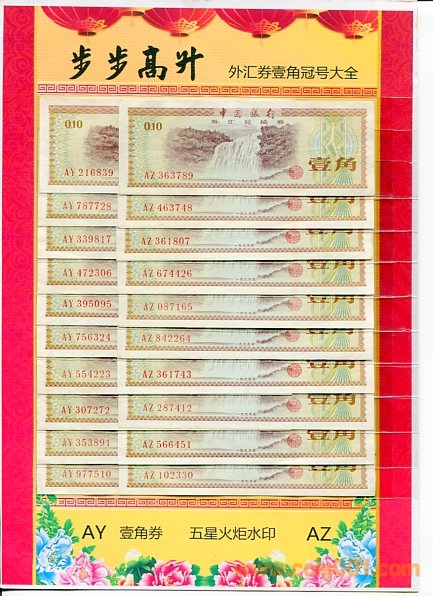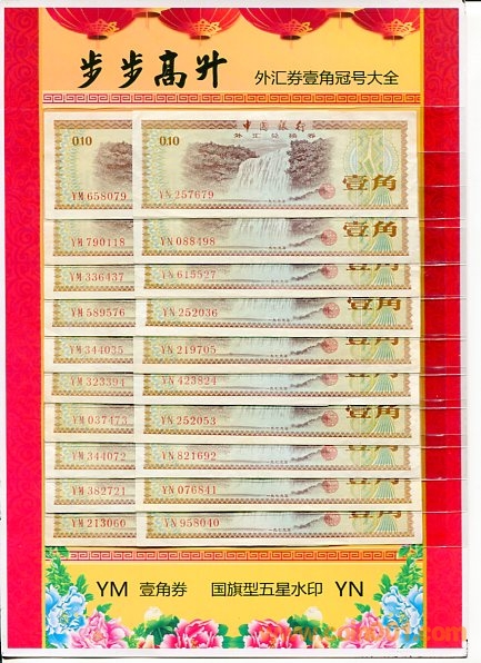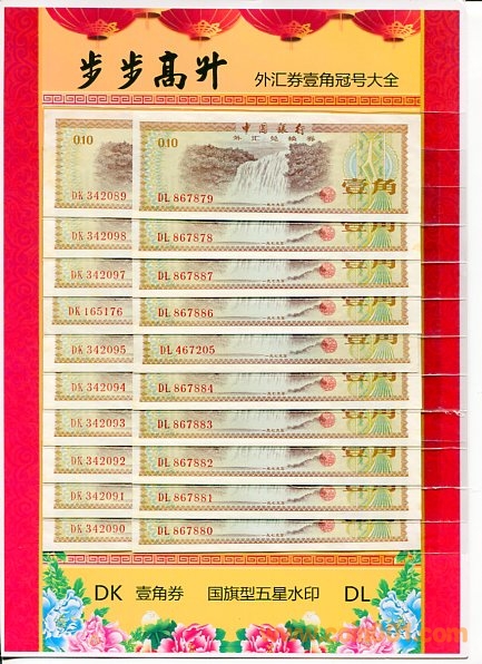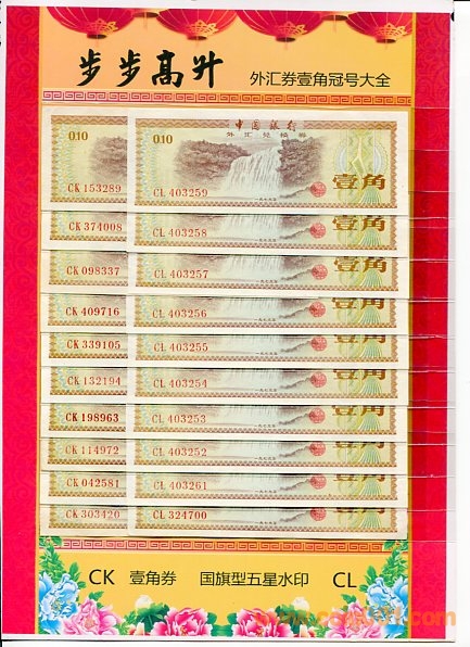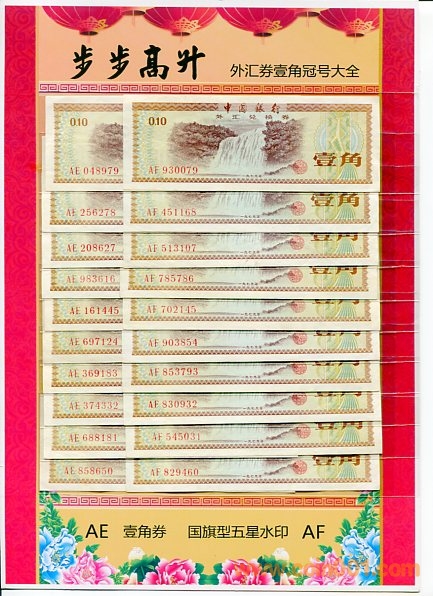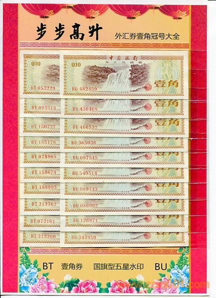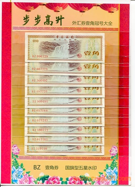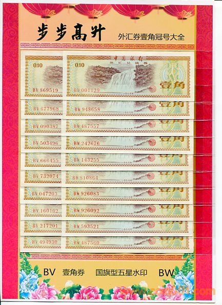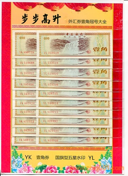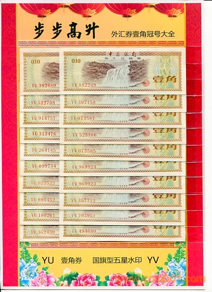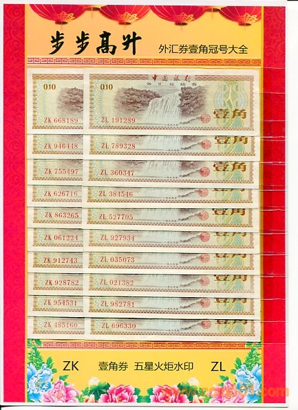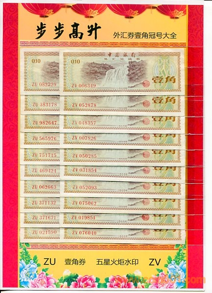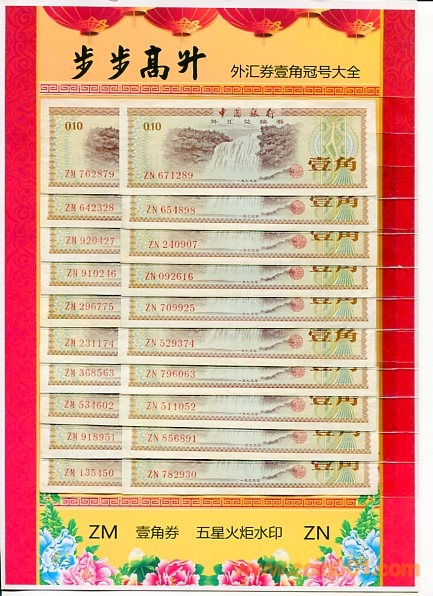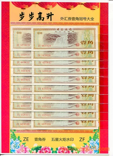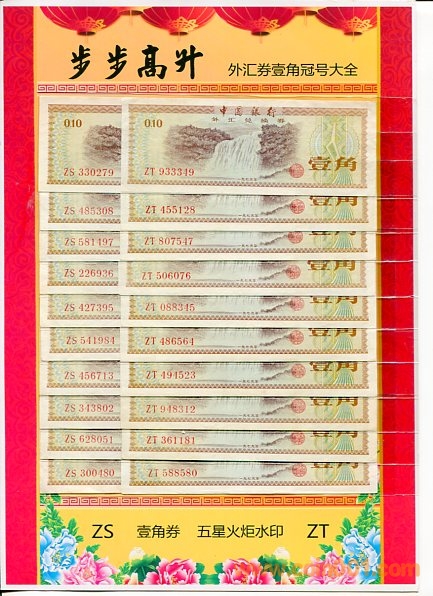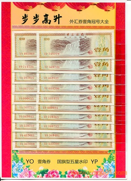自序 1978年12月,黨的十一屆三中全會作出了實行改革開放的重大決策;中華人民共和國從此進入了具有深遠歷史意義的轉折時期,開創(chuàng)一條建設中國特色的社會主義道路。改革開放之初,由于一切都是在探索性的實踐中,致使很多措施不夠明確,執(zhí)行起來顯得混亂;尤其在金融方面,在一次次涌入大量外資后,出現(xiàn)了在國內(nèi)與人民幣變相交換和流通的現(xiàn)象,嚴重擾亂了正常的經(jīng)濟活動與金融市場,給國家經(jīng)濟造成了重大損失。為搞好金融秩序,維護人民幣的穩(wěn)定和唯一法定貨幣的地位,理順人民幣與外幣難以逾越的關系,使改革開放能順利、有序地進行,國家最高行政管理機關—國務院,授權予歷史悠久且有豐富外匯兌換經(jīng)驗的國有商業(yè)銀行—中國銀行,于1980年4月,正式發(fā)行與人民幣等值流通的有價證券:外匯兌換券(以下簡稱:外匯券)。外匯券發(fā)行的目的,是為了方便來華工作、生活的,以持外幣為主的外國人、華僑、港澳臺同胞,在中國大陸的衣食住行等消費活動。外匯券(外幣按當時的比價兌換成外匯券)可在全國指定的涉外商店(華僑商店),購買當時屬于統(tǒng)購統(tǒng)銷的緊缺商品和高檔的進口免稅商品,住上接待外賓的高級賓館,坐上有級別才能進入的軟臥火車和飛機,享受著高人一等的待遇??梢哉f,外匯券與人民幣在實際使用方面相比,其性價比還要高。為了緩和當時的政治氣氛,中國銀行秉承了以往發(fā)行紙幣的一貫風格,將國內(nèi)著名的名勝古跡、名山大川,作為紙幣的正面圖案,還有文學大家郭沫若先生的行名題詞,印在券面上。將它們美倫美奐地呈獻在世人面前,猶如一幅幅精美絕倫的名作,使人更加賞心悅目。將紙幣這種特殊的藝術品,在發(fā)揮貨幣功能的同時,讓使用者能更加多地了解中國,起到國家名片的作用,從而激發(fā)他們的旅游興趣;并讓他們在各種活動中,參與更多的消費,帶動旅游業(yè)的發(fā)展,為國家賺取更多的外匯,支持國家的經(jīng)濟建設。隨著改革開放的持續(xù)、深入的發(fā)展和全國人民的共同努力,中國已從貧窮落后且備受欺凌的弱國,躍進為世界第二大經(jīng)濟體的強國;人民的生活水平逐年提高,迎來了闊別一百多年的繁榮盛世。外匯券自問世至完成歷史使命,在短短十五年多的時間里,見證了改革開放從探索、鞏固到發(fā)展的歷史進程,在出色完成祖國賦予的重要而光榮的任務后,功成身退,進入了收藏領域。由于外匯券誕生在改革開放這一特定歷史時期,具有特別的歷史意義和文物價值,且印刷精美,猶如一幅幅優(yōu)美動人的山水藝術作品,是一個非常值得珍藏的種類。在退出流通后,初時曾一票難求。外匯券的發(fā)行,不僅穩(wěn)定了金融秩序,大大方便了來華工作、生活的外國人、華僑、港澳臺同胞在中國大陸的交流活動,并逐漸帶旺了旅游業(yè),還為國家?guī)砹舜罅康耐鈪R收入,大力支持了經(jīng)濟建設,帶動了改革開放的健康發(fā)展。外匯券由于使用的范圍不大,所以發(fā)行的總量不多。以七九年版外匯券中發(fā)行量最大的壹角券為例,壹角券總共發(fā)行了127個冠號,每個冠號的后面是六位阿拉伯數(shù)字,總發(fā)行量為一億多張,與同時期使用的第三、四版人民幣壹角券幾百億(按發(fā)行的冠號估算)的發(fā)行量相比,外匯券的發(fā)行量就顯得微不足道了。同時由于其可在特定的商店,購買緊缺商品的優(yōu)越使用條件和當時較低的生活水平,在即將停止使用和兌換時,大多數(shù)都被交換成為商品,或換成了人民幣,被銀行回籠銷毀了。因此,外匯券的總存世量相當少。本組集以陳正統(tǒng)老師的研究成果—外匯兌換券冠號大全(總共有324個冠號)為基礎,選取其中的壹角券與壹圓券冠號大全(共201個冠號)進行擴展,將201個冠號的尾數(shù)從0—9組合起來,形成這套總數(shù)達到2010張的步步高升的龐大組集,是一部難度非常高的、超大型的冠號大全組集。外匯券因為使用時間短(1980年至1995年),回收率高,存世量少,部分冠號非常稀少難得。據(jù)陳正統(tǒng)老師在多個大型錢幣交流網(wǎng)站近四年連續(xù)性的統(tǒng)計,壹角券的ZV、CO、DQ和壹圓券的AO、DQ等五個珍稀冠號,每個冠號的存世量只有二、三百張,而且分布在全國各地的集藏者手中,能得到一張也屬不易,而集齊201個冠號的更少。本人受到陳正統(tǒng)老師的啟發(fā),在廣州縱原郵幣卡市場經(jīng)營后,一直以收集外匯券為主,通過不斷的收購交換,于2008年8月就集齊了324種的冠號大全,并在2009年6月在廣州舉辦的第一屆五羊杯(全國)錢幣收藏展中,獲得了傳統(tǒng)類的最高獎—五羊杯。隨著藏品數(shù)量不斷增加,我開始嘗試收集一套壹角券與壹圓券的8尾冠號大全,經(jīng)過幾個月的努力,我集齊了。之后受到步步高升禮品小冊的啟發(fā),又開始挑戰(zhàn)更高的難度,要集一套壹角券和壹圓券尾號從0—9的步步高升冠號大全,總數(shù)量是2010張。我知道,相對于324種不同尾號的外匯券冠號大全來說,這次的收集難度會更大,所以計劃用3至4年的時間來完成。為什么呢?因為一些冠號的存世量本來就稀少,別人即使有,也不一定會讓給你,要集齊不同尾號的十套可能容易一些,但要集齊步步高升的冠號大全,就不是集201個冠號十套那么簡單了,基本上相當于要收集2010個冠號,因為除了十組201
