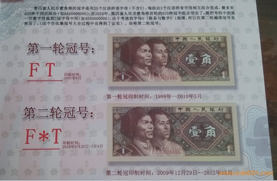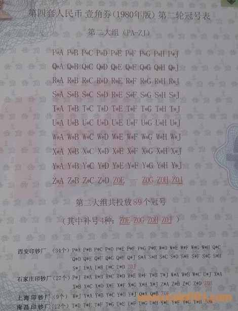 第二輪冠號共計(jì)七大組,共344個冠號(其中補(bǔ)號22個),本珍藏冊中詳細(xì)介紹了第二輪冠號印制的時間,印鈔廠家,投放區(qū)域,發(fā)行時間,為收藏愛好者提供了寶貴的依據(jù)。