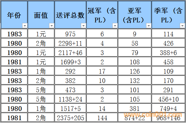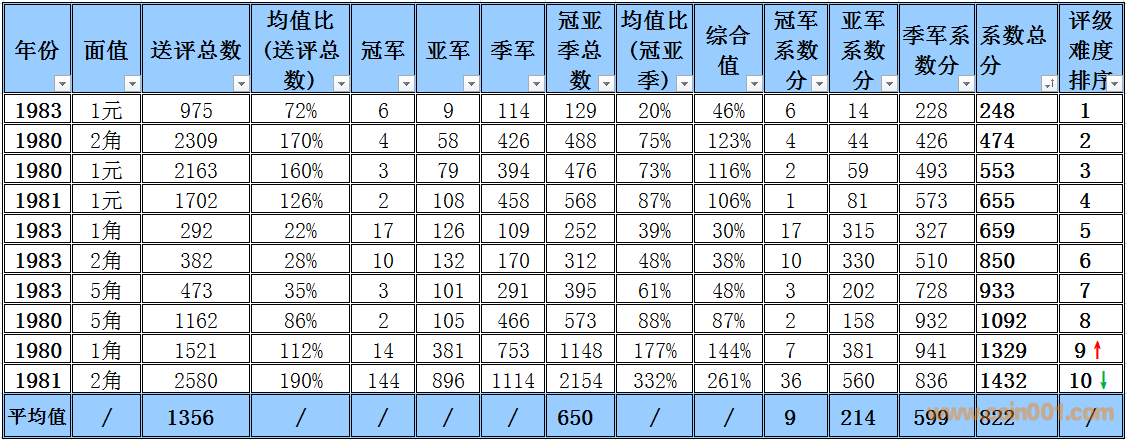 難度排序的選擇標(biāo)準(zhǔn):送評(píng)總數(shù)的平均值高于100%的普制長(zhǎng)城幣,低于100%的數(shù)據(jù)將不體現(xiàn)在難度排序中