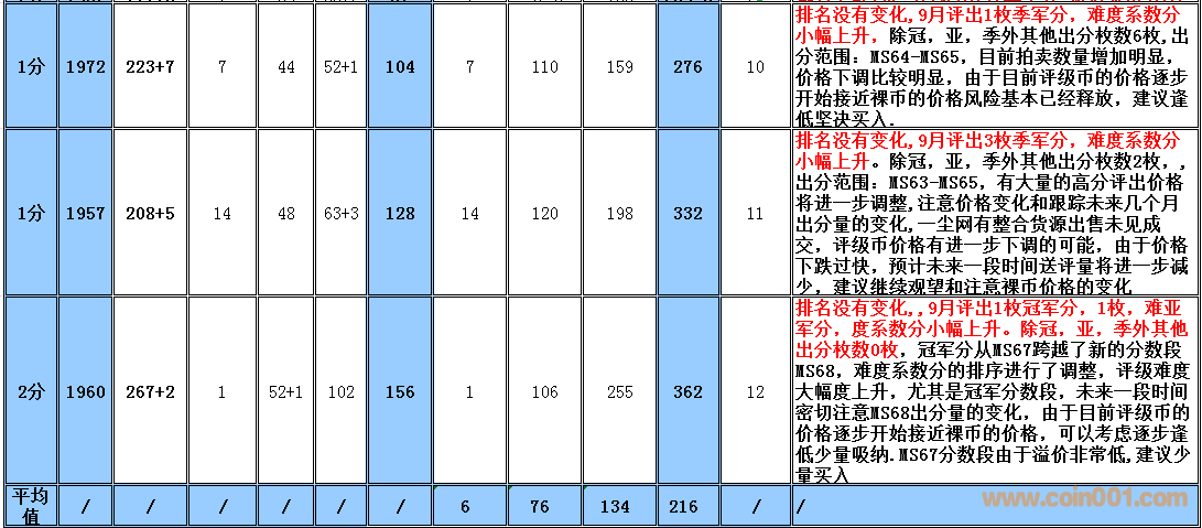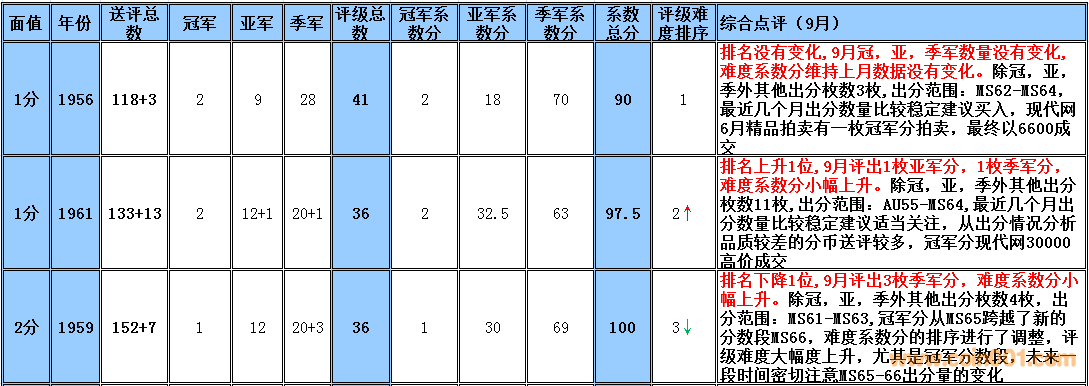 備:這個采樣的范圍會有一定的誤差,我將根據市場和評級量的變化每個季度第一周作出適當的調整,難度系數分在未來如果超過1000分將剔除。 1960年2分在一塵有大量貨源出現,位置由原來的第一檔次調整到第二檔次。難度系數排序暫時保留,如分數超過1000分將刪除,請大家留意!
