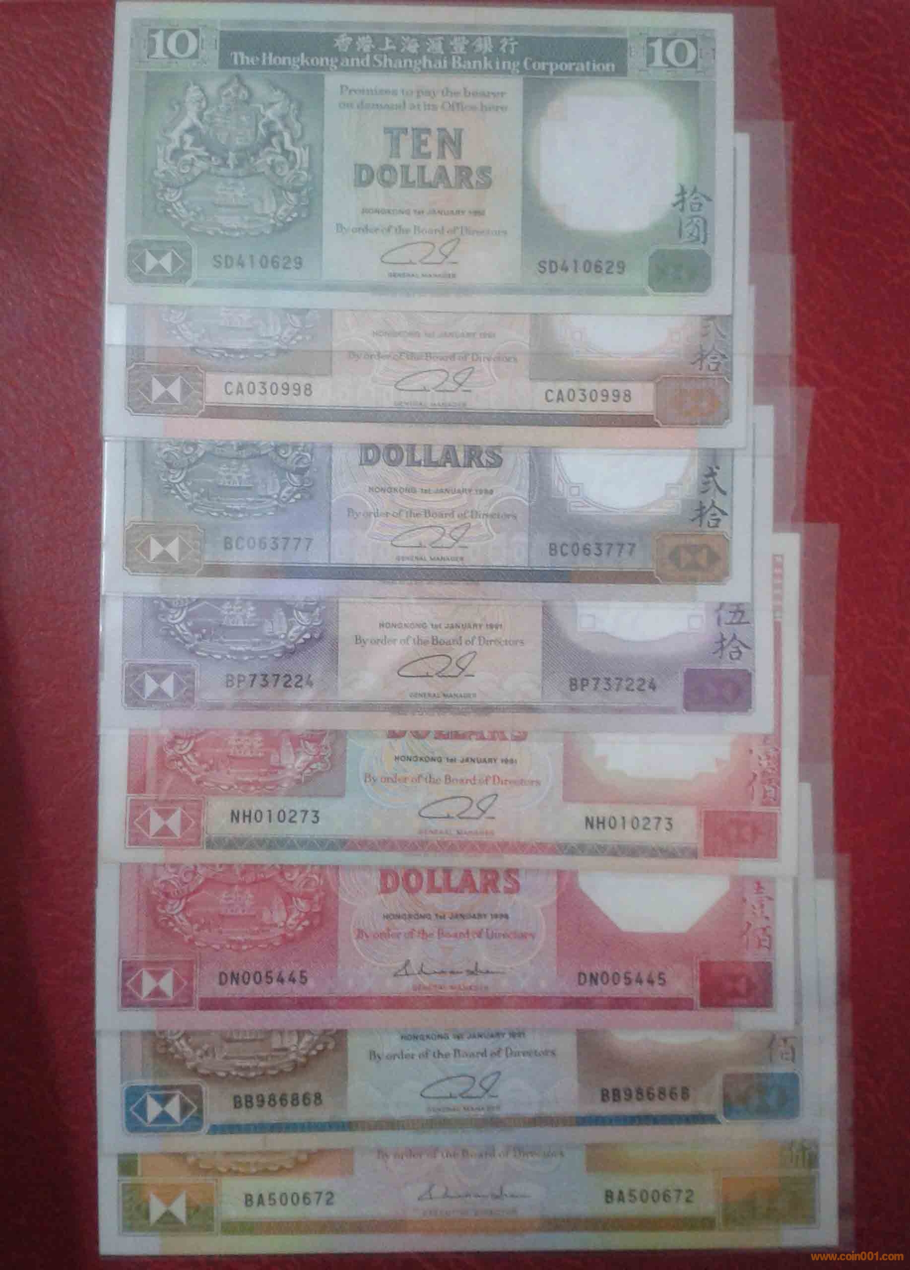 出一套1986年-1992年,香港匯豐銀行小全套,一套8張