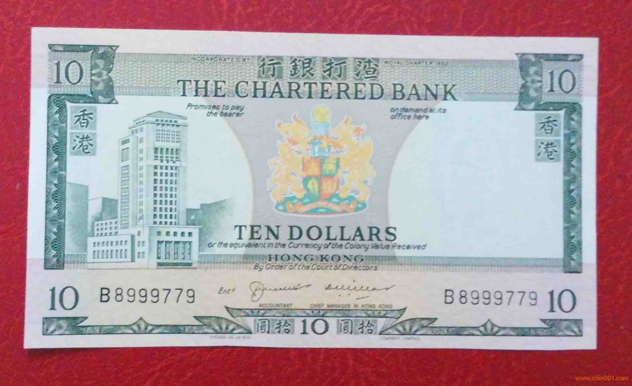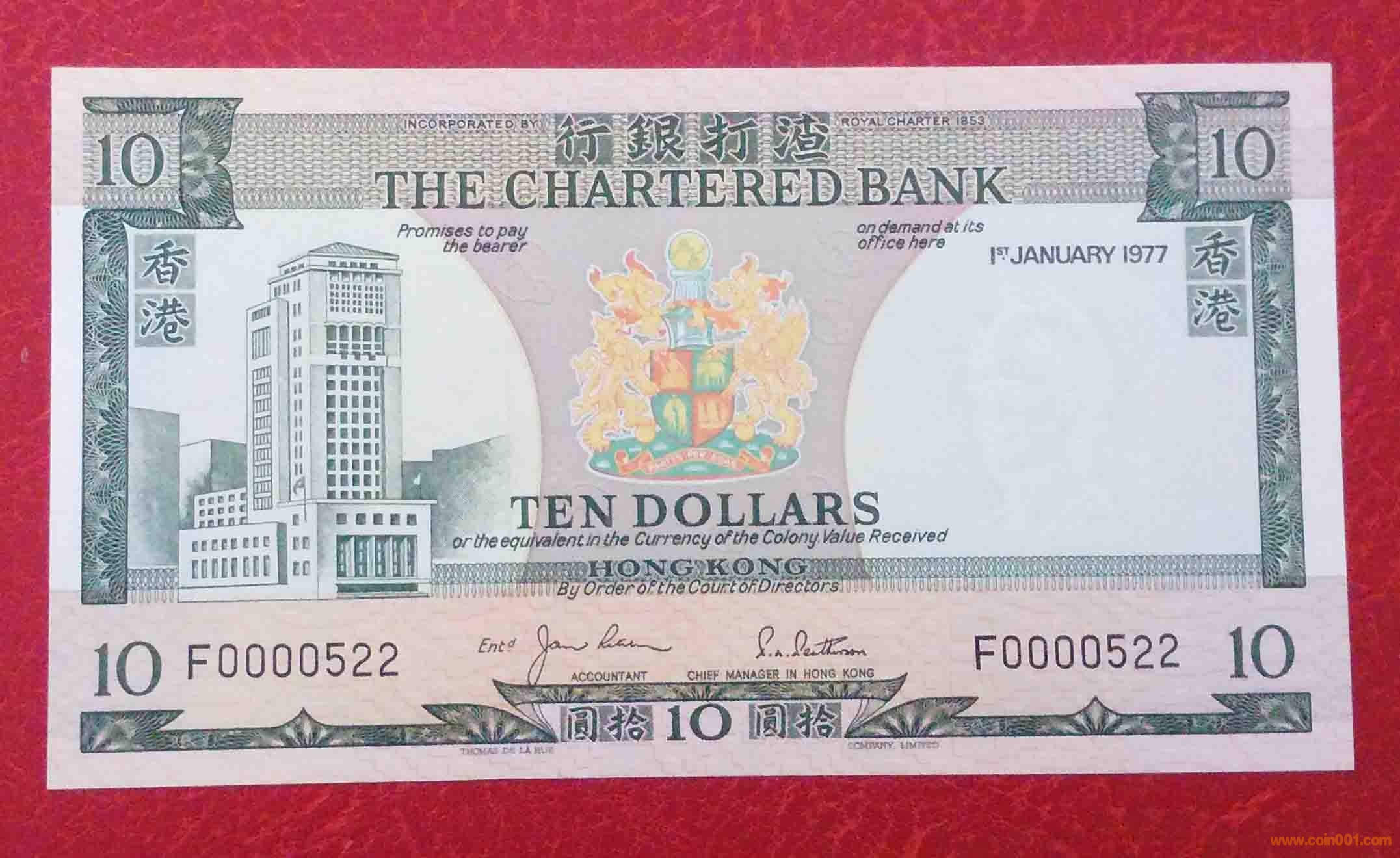 1)1977年,香港渣打銀行,屋仔,拾圓,F(xiàn),0000522,絕品! 560元