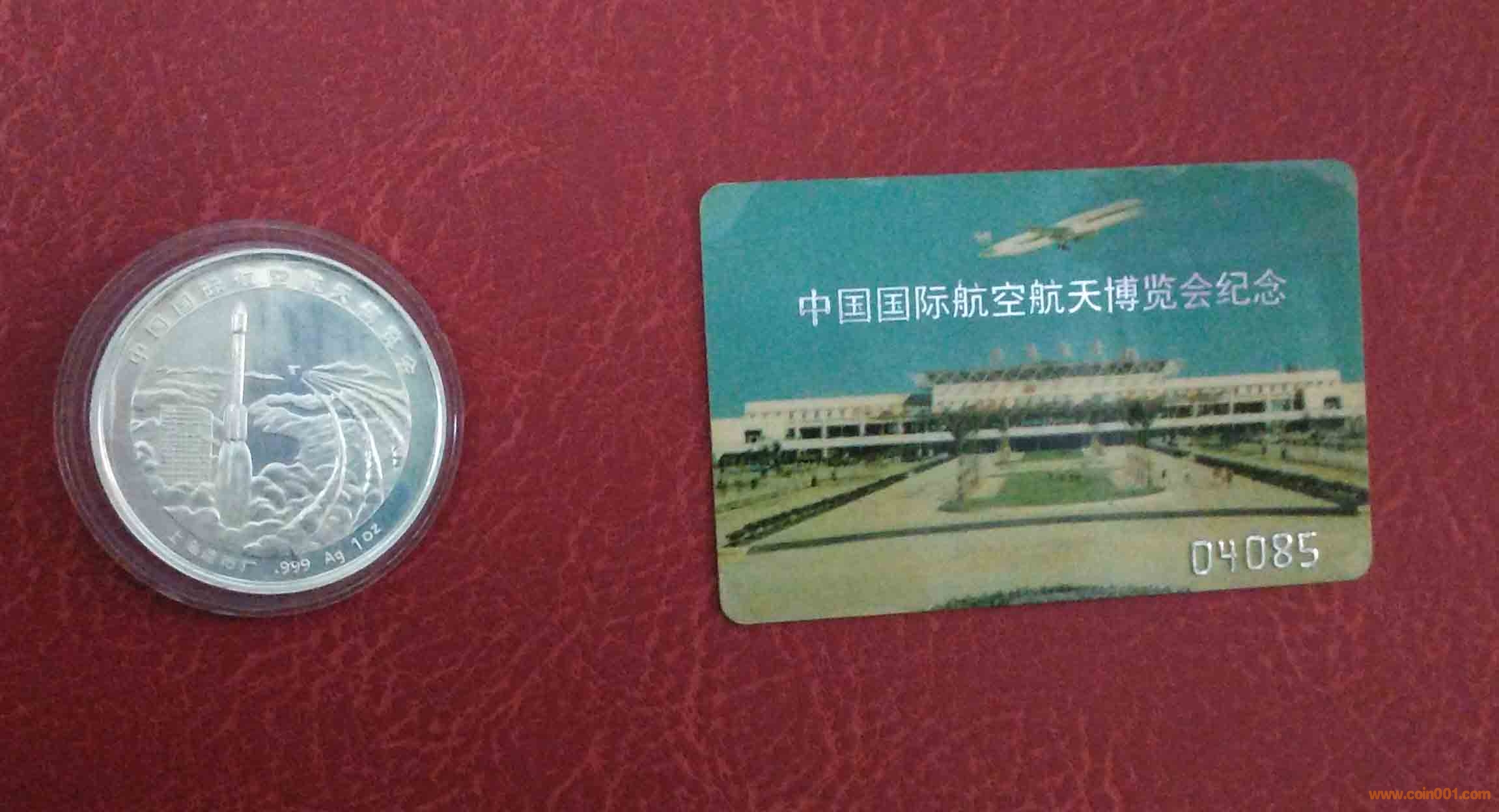中國國際航空航天博覽會紀念章,由中國國際航空航天博覽會組委會發(fā)行,上海制造廠鑄造。銀章正面圖案為中華人民共和國地圖,地圖中間鑲有一塊純金制中國國際航空航天博覽會會徽。銀章背面圖案為反映我國航空航天事業(yè)成果的長征二號火箭升空及飛機飛行浮雕。銀章直徑40毫米,重一盎司,成色999,限量鑄造發(fā)行1萬枚。