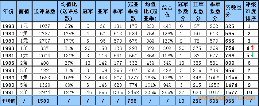普制長城幣評級難度排序2015-4 普制長城幣評級難度排序與早期分幣難度排序有明顯的區(qū)別,為了能體現(xiàn)難度系數(shù)的準確性和科學性在計算時考慮的因素相對要復雜一些,主要參考了評級的總數(shù),均值比(送評總數(shù)),冠亞季軍總數(shù),均值比(冠亞季總數(shù))等數(shù)據(jù)作為計算的主要依據(jù),同時各個均值段的補償方法也比較復雜 首先我們需要討論評級幣的價格構成 評級幣的價格構成 裸幣的價格+評級溢價+評級費用=評級幣的參考價格 主要可以參考以下2個因數(shù), 第一個因素為裸幣本生的價格(它的價格變動主要依據(jù)裸幣成交價格的變動而變動與評級溢價之間的關系不大) 舉例來說: 裸幣的價格上漲1倍評級難度系數(shù)沒有變化的話,評級幣的價格應該相應的上漲1倍+溢價+評級費用=評級幣的參考價格,裸幣的價格的上漲只能帶動評級幣裸幣部分的上升,裸幣價格下跌,評級難度系數(shù)沒有變化的話,評級幣的價格為裸幣下跌的價格+溢價+評級費用=評級幣的參考價格,裸幣的價格的下跌只能帶動評級幣裸幣部分的下跌 第二個因素為評級難度所產(chǎn)生的一個溢價 難度系數(shù)越高它對應的溢價就越高。溢價變化主要依據(jù)評級難度系數(shù)與系數(shù)平均值的變化和對比來決定,溢價水平的上升在一定的程度上會提升高品質裸幣的價格(卷光卷拆的硬幣)和品相的稀缺性,裸幣價格的下跌,如果評級難度提高的話評級幣的價格反而有可能會上升,從以上的結果可以得出下列結論,溢價是評級價格體系當中最重要的組成部分,溢價和裸幣的價格體系完全是獨立的,之間的價格沒有直接的聯(lián)系 備注:關于這個數(shù)據(jù)的準確性在設計這個表的時候我已經(jīng)考慮到了一個重評的可能性所以我只取冠,亞,季軍作為一個參考并同時設計了一個補償方案,重評從時間和金錢的角度來衡量的話不是非常經(jīng)濟且還存在一定的風險,但是從長遠看不能排除這個因數(shù)。雖然將來會產(chǎn)生一些誤差,但我認為誤差不會太大尤其在高分段和稀缺性的錢幣,對于普制長城幣來說NGC已經(jīng)作為收藏的主流其數(shù)據(jù)的準確性還是比較值得信賴的。 采樣的范圍 取樣范圍:1980-1985 普制長城幣 難度排序的選擇標準:送評總數(shù)的平均值高于100%的普制長城幣,低于100%的數(shù)據(jù)將不體現(xiàn)在難度排序中 計算公式: 評級總數(shù)/均值=均值比 考慮到1983年長城幣存世量明顯低于其他年份的普制長城幣,1983年的數(shù)據(jù)將保留和計入到難度排序中,大家可以通過下面的圖表黃色部分發(fā)現(xiàn)被刪除的年份主要是送評溢價不高的年份,如果未來送評量穩(wěn)步上升的話,它將加入到采樣的范圍. 備:這個采樣的范圍會有一定的誤差,我將根據(jù)均值比的變化每個季度第一周進行適當?shù)恼{整,由于普制長城幣的版別比較復雜,無法進行細分這里主要以年份為主,請大家諒解! 采樣的數(shù)據(jù)和計算的依據(jù) 統(tǒng)計第一檔次每個年份冠,亞,季的出分數(shù)量作為一個分析依據(jù),為了能更加的量化我用數(shù)字的方法進行統(tǒng)計,方法如下: 調整后的均值比 普制長城幣的計算方法如下: 綜合值的計算方法: (送評總數(shù)均值比+冠亞季總數(shù)均值比)÷2=綜合值 具體計算方法如下: 均值比在0-50% 冠軍分1枚為1分2枚2分以此類推,亞軍分1枚為2分2枚4分以此類推,季軍1枚為3分2枚6分以此類推 補償方法如下: 如果冠軍分的評分數(shù)量大于總數(shù)(冠,亞,季之和)的15%,冠軍分的1枚為1.5分,如果冠軍分的評分數(shù)量大于總數(shù)(冠,亞,季之和)的50%冠軍分的1枚為2分 如果亞軍分的評分數(shù)量大于總數(shù)(冠,亞,季之和)的35%,亞軍分的1枚為2.5分,如果亞軍分的評分數(shù)量低于總數(shù)(冠,亞,季之和)的25%亞軍分的1枚為1.5分 季軍分的評分數(shù)量大于總數(shù)(冠,亞,季之和)的65%,季軍分的1枚為2.5分, 季軍分的評分數(shù)量大于總數(shù)(冠,亞,季之和)的85%,季軍分的1枚為2分 均值比在50-100% 冠軍分1枚為1分2枚2分以此類推,亞軍分1枚為1.5分2枚3分以此類推,季軍1枚為2分2枚4分以此類推 此范圍+值補償 如果冠軍分的評分數(shù)量大于總數(shù)(冠,亞,季之和)的50%冠軍分的1枚為1.25分 如果亞軍分的評分數(shù)量大于總數(shù)(冠,亞,季之和)的35%,亞軍分的1枚為1.75分 均值比在100-150% 冠軍分1枚為0.5分2枚1分以此類推,亞軍分1枚為1分2枚2分以此類推,季軍1枚為1.5分2枚3分以此類推 補償方法如下: 如果冠軍分的評分數(shù)量大于總數(shù)(冠,亞,季之和)的15%,冠軍分的1枚為0.75分,如果冠軍分的評分數(shù)量大于總數(shù)(冠,亞,季之和)的50%冠軍分的1枚為1分 如果亞軍分的評分數(shù)量大于總數(shù)(冠,亞,季之和)的35%,亞軍分的1枚為1.25分,如果亞軍分的評分數(shù)量低于總數(shù)(冠,亞,季之和)的25%亞軍分的1枚為0.75分 季軍分的評分數(shù)量大于總數(shù)(冠,亞,季之和)的65%,季軍分的1枚為1.25分, 季軍分的評分數(shù)量大于總數(shù)(冠,亞,季之和)的85%,季軍分的1枚為1分 均值比在150%-180% 冠軍分1枚為0.5分2枚1分以此類推,亞軍分1枚為0.75分2枚1.5分以此類推,季軍1枚為1.25分2枚2.5分以此類推 如果冠軍分的評分數(shù)量大于總數(shù)(冠,亞,季之和)的15%,冠軍分的1枚為0.62分,如果冠軍分的評分數(shù)量大于總數(shù)(冠,亞,